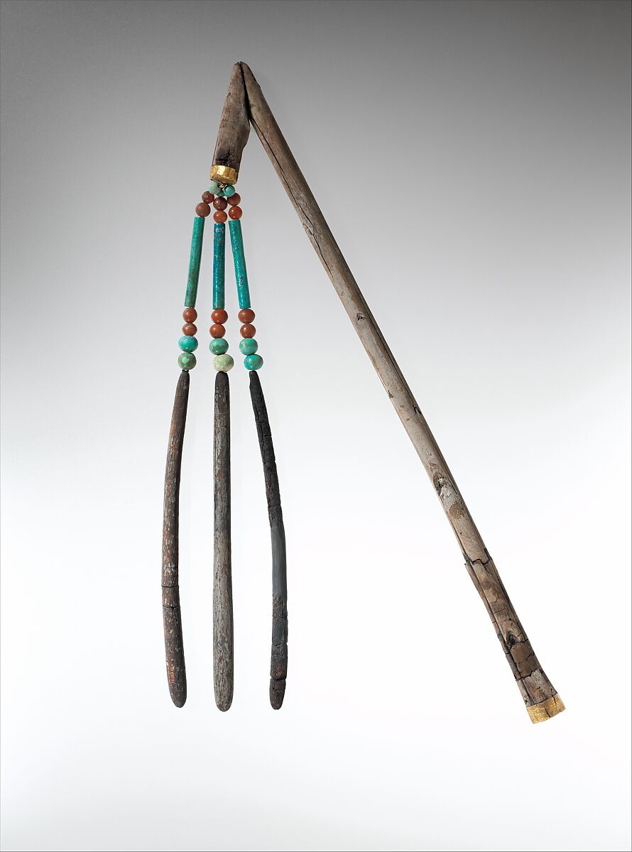 One of the complete burial groups excavated at Meir belonged to the Steward Hapiankhtifi. When the mummy was unwrapped in the Museum numerous objects were discovered: a model dagger and sheath, two mirrors, a bat amulet and jewelry. A ceremonial flail, an emblem of Osiris with whom the deceased wanted to be identified, was found broken and scattered throughout the coffin. The flail has a wooden handle tipped with gold leaf at either end and three pendants. The long end pendants are connected to the handle by three long cylindrical blue faience beads with two carnelian and one green faience bead toward the handle and two carnelian and two green faience beads toward the pendants.
