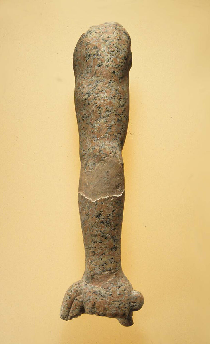 This powerfully modeled arm from a life-size statue was found in the tomb of a high official. Because of its size, the arm probably did not belong to a statue depicting the tomb owner, but rather to a royal sculpture. It is likely a displaced piece from a statue of Senwosret I that originally stood in his pyramid complex nearby.