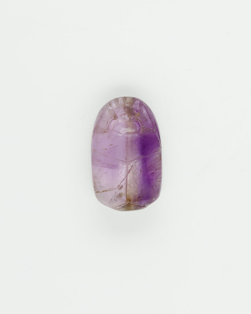 This scarab was made out of amethyst, a semi-precious stone. Its flat underside is undecorated, which is often the case for scarabs in semi-precious stones. Possibly the shape and material of such scarabs might have been regarded as providing enough magical power without added text or images, though an additional inscribed gold plate might have originally covered the scarab’s base.
