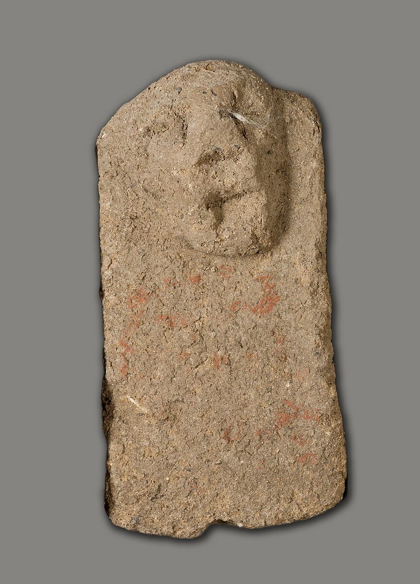These tablets of unfired clay with attached crude faces were found as a group by the Museum's excavators at Lisht South in loose surface sand west of the mastaba of Senwosretankh, a high official and possibly the architect of the pyramid complex of Senwosret I (ca. 1961–1917 B. C.), east of which he erected his own very elaborate mastaba tomb (see acc. nos. 33.1.2 and other pieces). The mud figures and little coffin (acc. no. 33.1.66) that had contained some of them must have been buried, however, considerably later than the early twelfth dynasty tomb close to which they were found. In fact, during the thirteenth and following dynasties people deposited a number of objects in the by then sacred area around a legendary ruler's pyramid and its dependant monuments, believing conceivably that potent magical powers could thus be released. These flat mud figures, for instance, are inscribed in now much-faded red paint with the names of men identified as enemies (most of them Egyptians but some with foreign names). Their deposition may have been thought to effect their destruction.