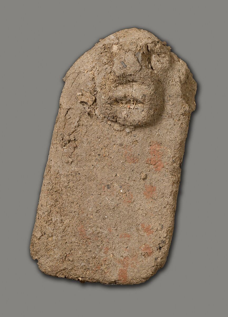 These tablets of unfired clay with attached crude faces were found as a group by the Museum's excavators at Lisht South in loose surface sand west of the mastaba of Senwosretankh, a high official and possibly the architect of the pyramid complex of Senwosret I (ca. 1961–1917 B. C.), east of which he erected his own very elaborate mastaba tomb (see acc. nos. 33.1.2 and other pieces). The mud figures and little coffin (acc. no. 33.1.66) that had contained some of them must have been buried, however, considerably later than the early twelfth dynasty tomb close to which they were found. In fact, during the thirteenth and following dynasties people deposited a number of objects in the by then sacred area around a legendary ruler's pyramid and its dependant monuments, believing conceivably that potent magical powers could thus be released. These flat mud figures, for instance, are inscribed in now much-faded red paint with the names of men identified as enemies (most of them Egyptians but some with foreign names). Their deposition may have been thought to effect their destruction.