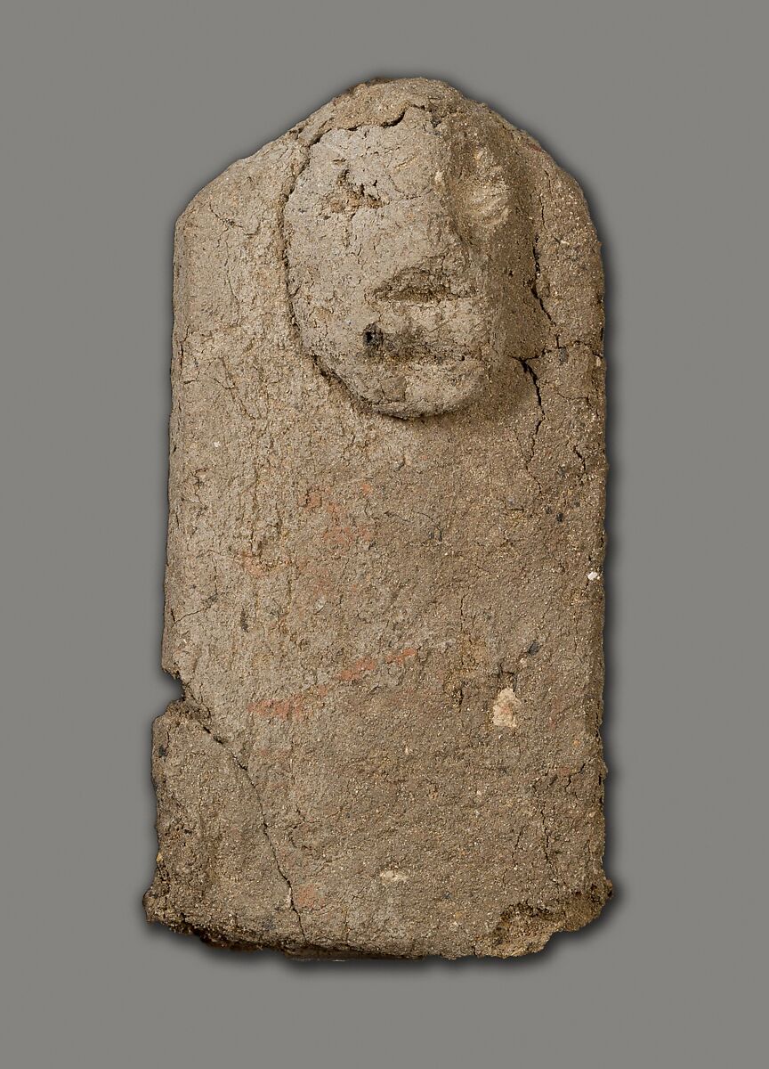 These tablets of unfired clay with attached crude faces were found as a group by the Museum's excavators at Lisht South in loose surface sand west of the mastaba of Senwosretankh, a high official and possibly the architect of the pyramid complex of Senwosret I (ca. 1961–1917 B. C.), east of which he erected his own very elaborate mastaba tomb (see acc. nos. 33.1.2 and other pieces). The mud figures and little coffin (acc. no. 33.1.66) that had contained some of them must have been buried, however, considerably later than the early twelfth dynasty tomb close to which they were found. In fact, during the thirteenth and following dynasties people deposited a number of objects in the by then sacred area around a legendary ruler's pyramid and its dependant monuments, believing conceivably that potent magical powers could thus be released. These flat mud figures, for instance, are inscribed in now much-faded red paint with the names of men identified as enemies (most of them Egyptians but some with foreign names). Their deposition may have been thought to effect their destruction.
