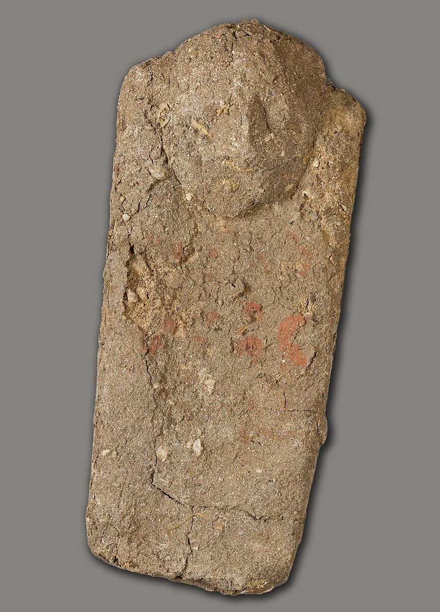 These tablets of unfired clay with attached crude faces were found as a group by the Museum's excavators at Lisht South in loose surface sand west of the mastaba of Senwosretankh, a high official and possibly the architect of the pyramid complex of Senwosret I (ca. 1961–1917 B. C.), east of which he erected his own very elaborate mastaba tomb (see acc. nos. 33.1.2 and other pieces). The mud figures and little coffin (acc. no. 33.1.66) that had contained some of them must have been buried, however, considerably later than the early twelfth dynasty tomb close to which they were found. In fact, during the thirteenth and following dynasties people deposited a number of objects in the by then sacred area around a legendary ruler's pyramid and its dependant monuments, believing conceivably that potent magical powers could thus be released. These flat mud figures, for instance, are inscribed in now much-faded red paint with the names of men identified as enemies (most of them Egyptians but some with foreign names). Their deposition may have been thought to effect their destruction.