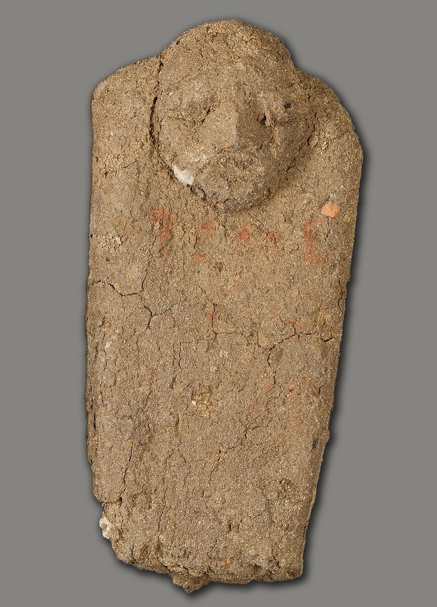 These tablets of unfired clay with attached crude faces were found as a group by the Museum's excavators at Lisht South in loose surface sand west of the mastaba of Senwosretankh, a high official and possibly the architect of the pyramid complex of Senwosret I (ca. 1961–1917 B. C.), east of which he erected his own very elaborate mastaba tomb (see acc. nos. 33.1.2 and other pieces). The mud figures and little coffin (acc. no. 33.1.66) that had contained some of them must have been buried, however, considerably later than the early twelfth dynasty tomb close to which they were found. In fact, during the thirteenth and following dynasties people deposited a number of objects in the by then sacred area around a legendary ruler's pyramid and its dependant monuments, believing conceivably that potent magical powers could thus be released. These flat mud figures, for instance, are inscribed in now much-faded red paint with the names of men identified as enemies (most of them Egyptians but some with foreign names). Their deposition may have been thought to effect their destruction.