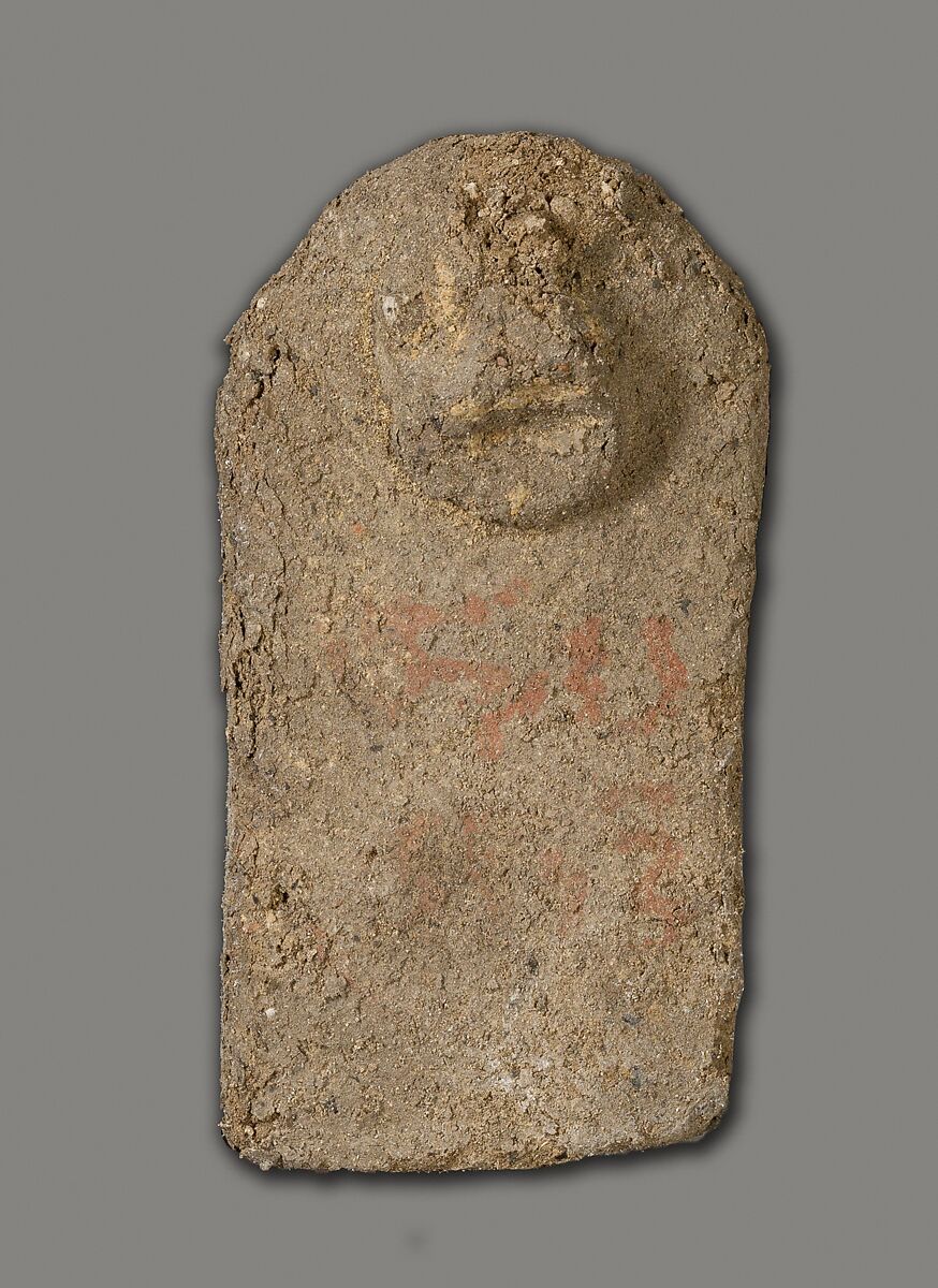 These tablets of unfired clay with attached crude faces were found as a group by the Museum's excavators at Lisht South in loose surface sand west of the mastaba of Senwosretankh, a high official and possibly the architect of the pyramid complex of Senwosret I (ca. 1961–1917 B. C.), east of which he erected his own very elaborate mastaba tomb (see acc. nos. 33.1.2 and other pieces). The mud figures and little coffin (acc. no. 33.1.66) that had contained some of them must have been buried, however, considerably later than the early twelfth dynasty tomb close to which they were found. In fact, during the thirteenth and following dynasties people deposited a number of objects in the by then sacred area around a legendary ruler's pyramid and its dependant monuments, believing conceivably that potent magical powers could thus be released. These flat mud figures, for instance, are inscribed in now much-faded red paint with the names of men identified as enemies (most of them Egyptians but some with foreign names). Their deposition may have been thought to effect their destruction.