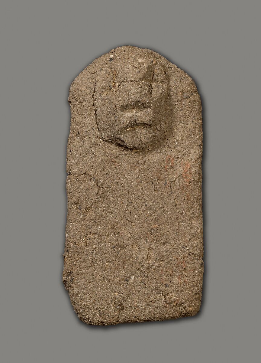 These tablets of unfired clay with attached crude faces were found as a group by the Museum's excavators at Lisht South in loose surface sand west of the mastaba of Senwosretankh, a high official and possibly the architect of the pyramid complex of Senwosret I (ca. 1961–1917 B. C.), east of which he erected his own very elaborate mastaba tomb (see acc. nos. 33.1.2 and other pieces). The mud figures and little coffin (acc. no. 33.1.66) that had contained some of them must have been buried, however, considerably later than the early twelfth dynasty tomb close to which they were found. In fact, during the thirteenth and following dynasties people deposited a number of objects in the by then sacred area around a legendary ruler's pyramid and its dependant monuments, believing conceivably that potent magical powers could thus be released. These flat mud figures, for instance, are inscribed in now much-faded red paint with the names of men identified as enemies (most of them Egyptians but some with foreign names). Their deposition may have been thought to effect their destruction.
