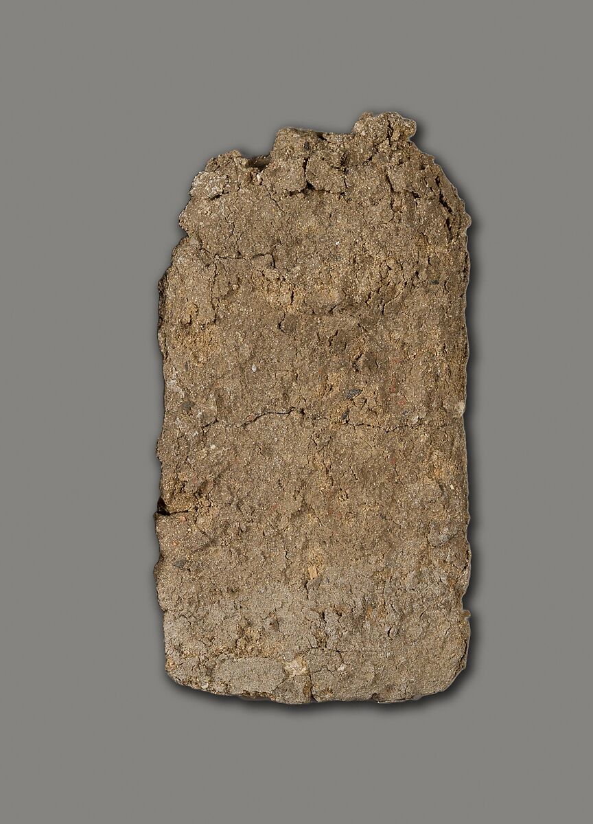 These tablets of unfired clay with attached crude faces were found as a group by the Museum's excavators at Lisht South in loose surface sand west of the mastaba of Senwosretankh, a high official and possibly the architect of the pyramid complex of Senwosret I (ca. 1961–1917 B. C.), east of which he erected his own very elaborate mastaba tomb (see acc. nos. 33.1.2 and other pieces). The mud figures and little coffin (acc. no. 33.1.66) that had contained some of them must have been buried, however, considerably later than the early twelfth dynasty tomb close to which they were found. In fact, during the thirteenth and following dynasties people deposited a number of objects in the by then sacred area around a legendary ruler's pyramid and its dependant monuments, believing conceivably that potent magical powers could thus be released. These flat mud figures, for instance, are inscribed in now much-faded red paint with the names of men identified as enemies (most of them Egyptians but some with foreign names). Their deposition may have been thought to effect their destruction.