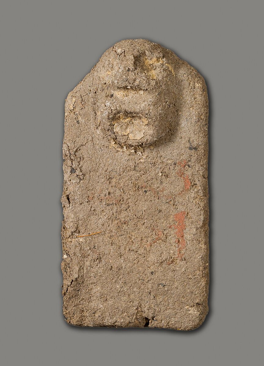 These tablets of unfired clay with attached crude faces were found as a group by the Museum's excavators at Lisht South in loose surface sand west of the mastaba of Senwosretankh, a high official and possibly the architect of the pyramid complex of Senwosret I (ca. 1961–1917 B. C.), east of which he erected his own very elaborate mastaba tomb (see acc. nos. 33.1.2 and other pieces). The mud figures and little coffin (acc. no. 33.1.66) that had contained some of them must have been buried, however, considerably later than the early twelfth dynasty tomb close to which they were found. In fact, during the thirteenth and following dynasties people deposited a number of objects in the by then sacred area around a legendary ruler's pyramid and its dependant monuments, believing conceivably that potent magical powers could thus be released. These flat mud figures, for instance, are inscribed in now much-faded red paint with the names of men identified as enemies (most of them Egyptians but some with foreign names). Their deposition may have been thought to effect their destruction.