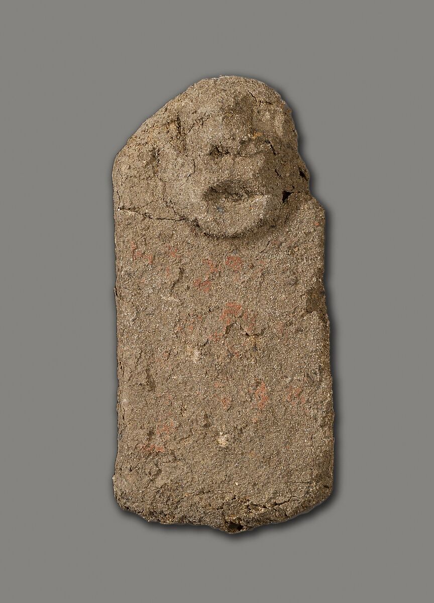 These tablets of unfired clay with attached crude faces were found as a group by the Museum's excavators at Lisht South in loose surface sand west of the mastaba of Senwosretankh, a high official and possibly the architect of the pyramid complex of Senwosret I (ca. 1961–1917 B. C.), east of which he erected his own very elaborate mastaba tomb (see acc. nos. 33.1.2 and other pieces). The mud figures and little coffin (acc. no. 33.1.66) that had contained some of them must have been buried, however, considerably later than the early twelfth dynasty tomb close to which they were found. In fact, during the thirteenth and following dynasties people deposited a number of objects in the by then sacred area around a legendary ruler's pyramid and its dependant monuments, believing conceivably that potent magical powers could thus be released. These flat mud figures, for instance, are inscribed in now much-faded red paint with the names of men identified as enemies (most of them Egyptians but some with foreign names). Their deposition may have been thought to effect their destruction.