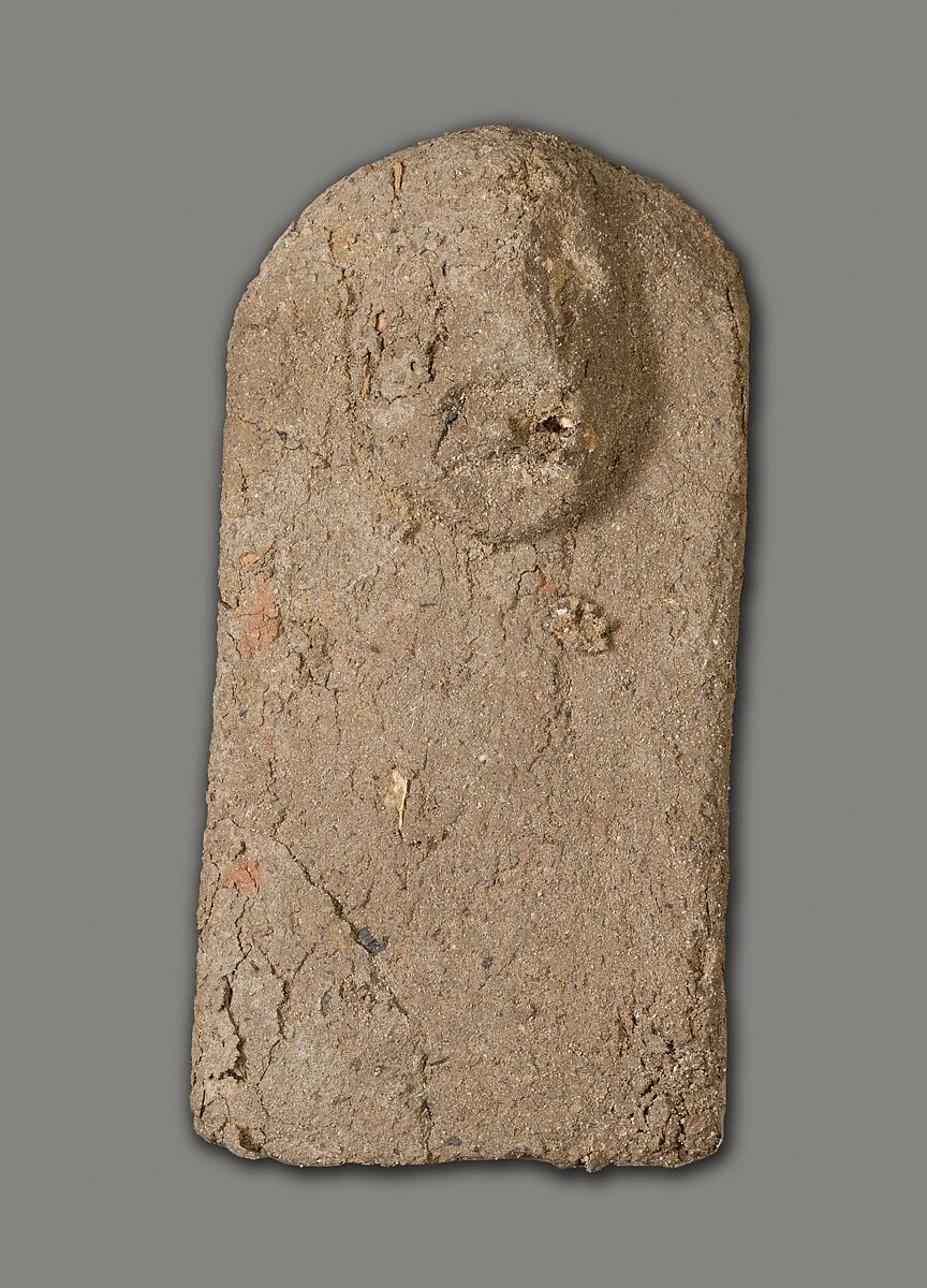 These tablets of unfired clay with attached crude faces were found as a group by the Museum's excavators at Lisht South in loose surface sand west of the mastaba of Senwosretankh, a high official and possibly the architect of the pyramid complex of Senwosret I (ca. 1961–1917 B. C.), east of which he erected his own very elaborate mastaba tomb (see acc. nos. 33.1.2 and other pieces). The mud figures and little coffin (acc. no. 33.1.66) that had contained some of them must have been buried, however, considerably later than the early twelfth dynasty tomb close to which they were found. In fact, during the thirteenth and following dynasties people deposited a number of objects in the by then sacred area around a legendary ruler's pyramid and its dependant monuments, believing conceivably that potent magical powers could thus be released. These flat mud figures, for instance, are inscribed in now much-faded red paint with the names of men identified as enemies (most of them Egyptians but some with foreign names). Their deposition may have been thought to effect their destruction.