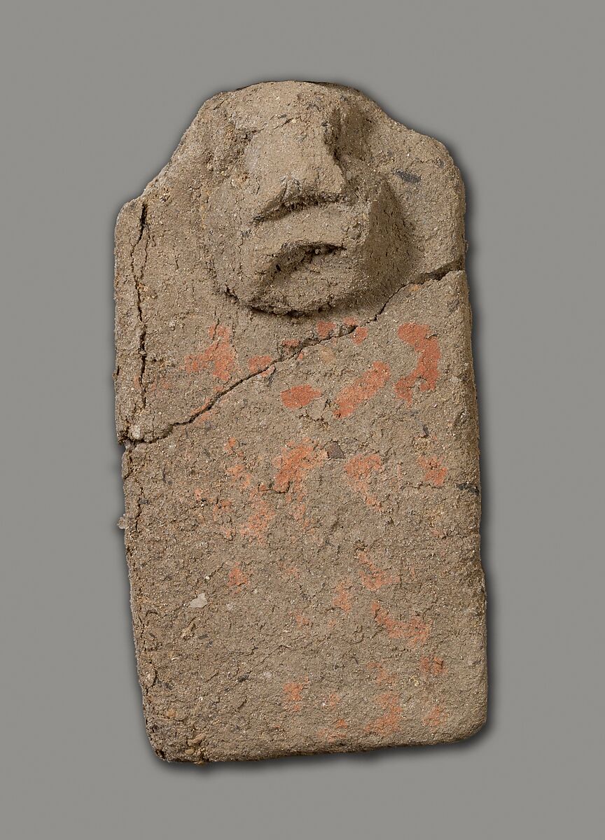 These tablets of unfired clay with attached crude faces were found as a group by the Museum's excavators at Lisht South in loose surface sand west of the mastaba of Senwosretankh, a high official and possibly the architect of the pyramid complex of Senwosret I (ca. 1961–1917 B. C.), east of which he erected his own very elaborate mastaba tomb (see acc. nos. 33.1.2 and other pieces). The mud figures and little coffin (acc. no. 33.1.66) that had contained some of them must have been buried, however, considerably later than the early twelfth dynasty tomb close to which they were found. In fact, during the thirteenth and following dynasties people deposited a number of objects in the by then sacred area around a legendary ruler's pyramid and its dependant monuments, believing conceivably that potent magical powers could thus be released. These flat mud figures, for instance, are inscribed in now much-faded red paint with the names of men identified as enemies (most of them Egyptians but some with foreign names). Their deposition may have been thought to effect their destruction.