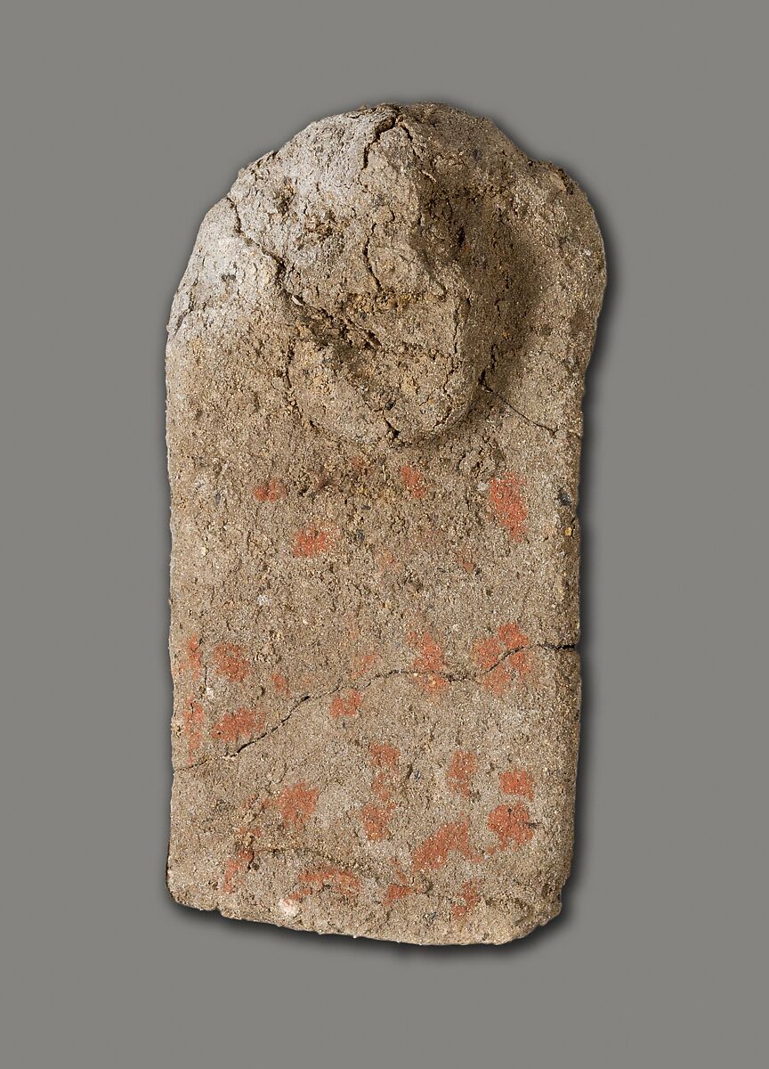 These tablets of unfired clay with attached crude faces were found as a group by the Museum's excavators at Lisht South in loose surface sand west of the mastaba of Senwosretankh, a high official and possibly the architect of the pyramid complex of Senwosret I (ca. 1961–1917 B. C.), east of which he erected his own very elaborate mastaba tomb (see acc. nos. 33.1.2 and other pieces). The mud figures and little coffin (acc. no. 33.1.66) that had contained some of them must have been buried, however, considerably later than the early twelfth dynasty tomb close to which they were found. In fact, during the thirteenth and following dynasties people deposited a number of objects in the by then sacred area around a legendary ruler's pyramid and its dependant monuments, believing conceivably that potent magical powers could thus be released. These flat mud figures, for instance, are inscribed in now much-faded red paint with the names of men identified as enemies (most of them Egyptians but some with foreign names). Their deposition may have been thought to effect their destruction.