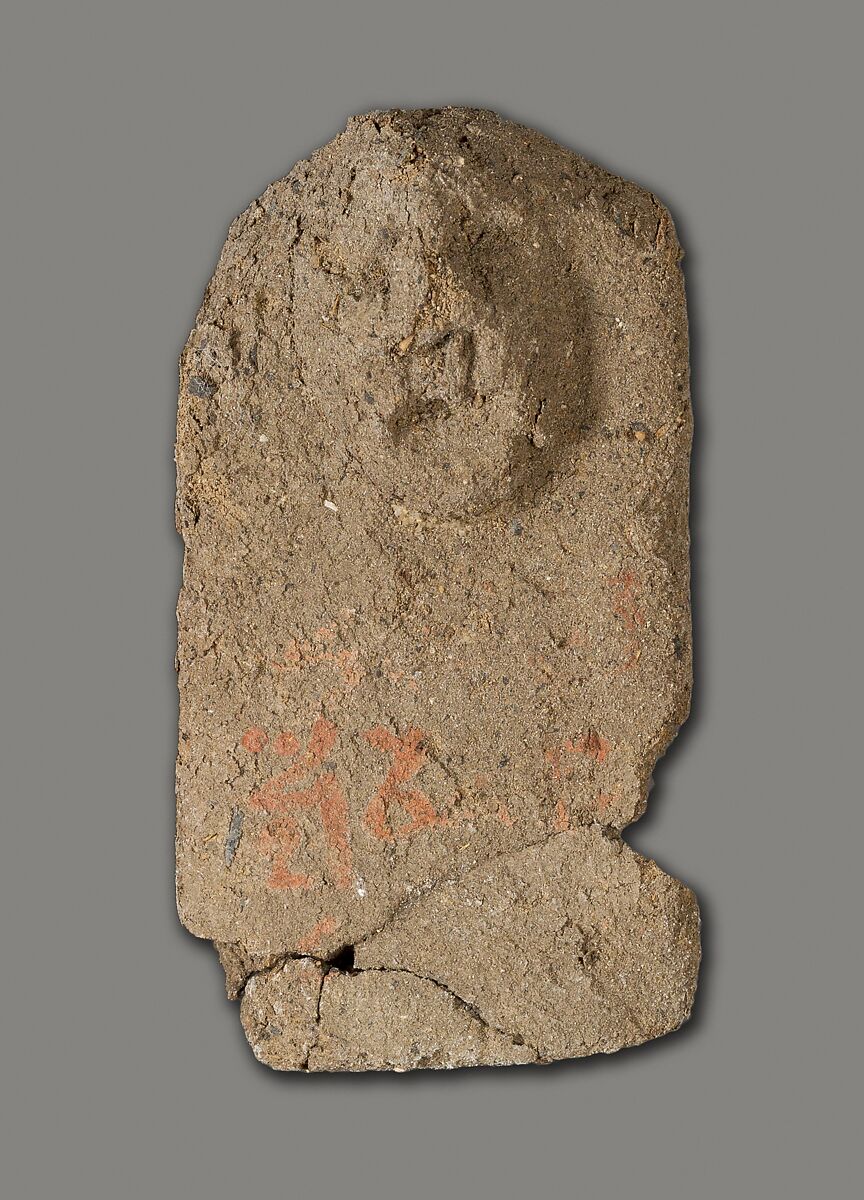 These tablets of unfired clay with attached crude faces were found as a group by the Museum's excavators at Lisht South in loose surface sand west of the mastaba of Senwosretankh, a high official and possibly the architect of the pyramid complex of Senwosret I (ca. 1961–1917 B. C.), east of which he erected his own very elaborate mastaba tomb (see acc. nos. 33.1.2 and other pieces). The mud figures and little coffin (acc. no. 33.1.66) that had contained some of them must have been buried, however, considerably later than the early twelfth dynasty tomb close to which they were found. In fact, during the thirteenth and following dynasties people deposited a number of objects in the by then sacred area around a legendary ruler's pyramid and its dependant monuments, believing conceivably that potent magical powers could thus be released. These flat mud figures, for instance, are inscribed in now much-faded red paint with the names of men identified as enemies (most of them Egyptians but some with foreign names). Their deposition may have been thought to effect their destruction.