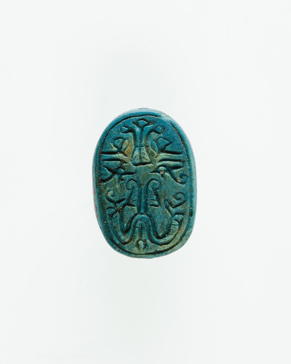 This scarab shows pairs of wedjat-eyes and the foreparts of a lion, signs that are frequently used to form symmetric compositions. The other signs and symbols, such as the papyrus, the crowned uraei (aroused cobra’s) and the hieroglyph for good and beautiful (nefer) reinforce the positive message of the design.