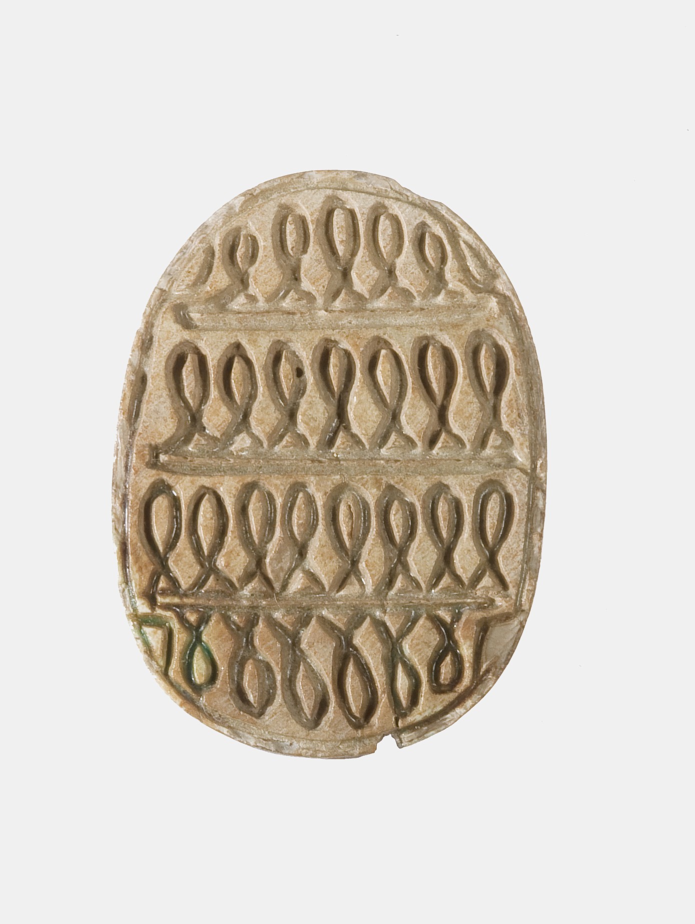 Soon afterwards, these often complex linear designs were imitated on Canaanite scarabs of the Middle Bronze Age (contemporary with the Second Intermediate Period in Egypt, ca. 1640-1550 B.C.). This scarab shows morphologic details that are characteristic for the late Middle Kingdom. The manner in which its back and sides are carved indicate that it was probably made in a scarab workshop near Lisht, where the Middle Kingdom capital was located. The scarab dates to the middle of Dynasty 13 (ca. 1766–1677 B.C.).