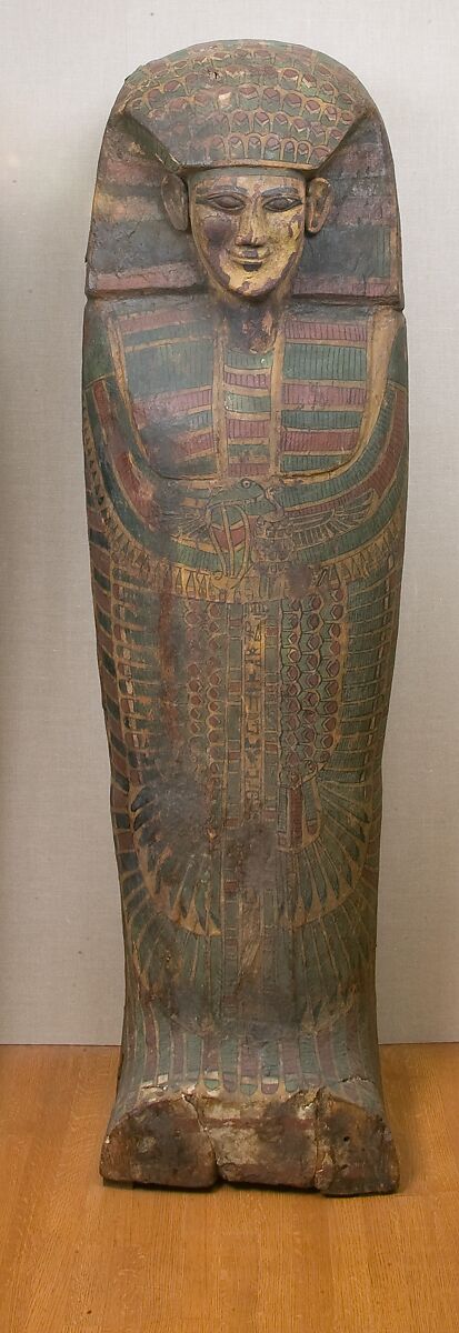 Rishi coffins like this one are characterized by the feather pattern painted on their lids and by their wedge-shaped faces. They are unique to Thebes in Dynasty 17 and early Dynasty 18. For other examples of this type, see 12.181.299; 30.3.4a, b–30.3.7a, b.