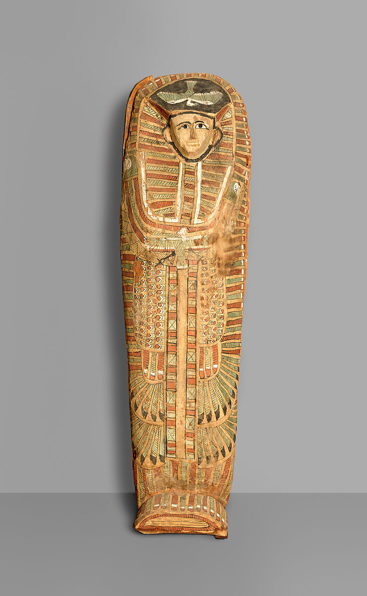 A royal nemes headdress, painted in reds and greens with black detailing, frames the triangular, crudely modeled and painted face. On the top of the head is a vulture. This usurpation of royal iconography is seen in a number of contexts in the Middle Kingdom and later, and seems to be related to the identification of the deceased with Osiris, king of the dead, and with mortuary rituals. The mummy-like form, which had only recently become common in the late Middle Kingdom, also links this type to mummification. Around the neck of the deceased is a broad festival collar with falcon-head terminals. On top of the collar is a second vulture figure, in this case holding an ankh, the hieroglyph for life, in one talon and a shen ring, symbolizing eternity, in the other. A long vertical band divides the remainder of the lid into two parts. This would in most cases be inscribed with an offering prayer, but here has been left blank. Three types of feathers can be distinguished on the body: short horizontal feathers flanking the vertical band, representing the body feathers of a bird (which could be a falcon, vulture, or hawk); vertical "tail" feathers just below; and two concentric ovals of longer feathers that fan out, creating the effect of wings.