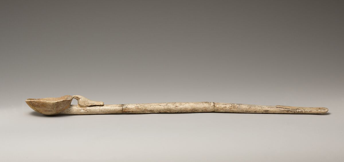 This early example of a toilet spoon (partly reconstructed) has a long handle, rounded for most of its length, and then tapering and flattening toward one end. Vertically through the flattened end is a hole, perhaps for suspension. At the other end is a hemispherical bowl to hold cosmetic material. Facing the bowl is the figure of a falcon that rests its beak on the rim. Although falcons are rarely depicted during this period, this high-soaring bird of prey was already beginning to take on solar connotations. The ivory from which this spoon was carved could be from either a hippopotamus or an elephant tusk.