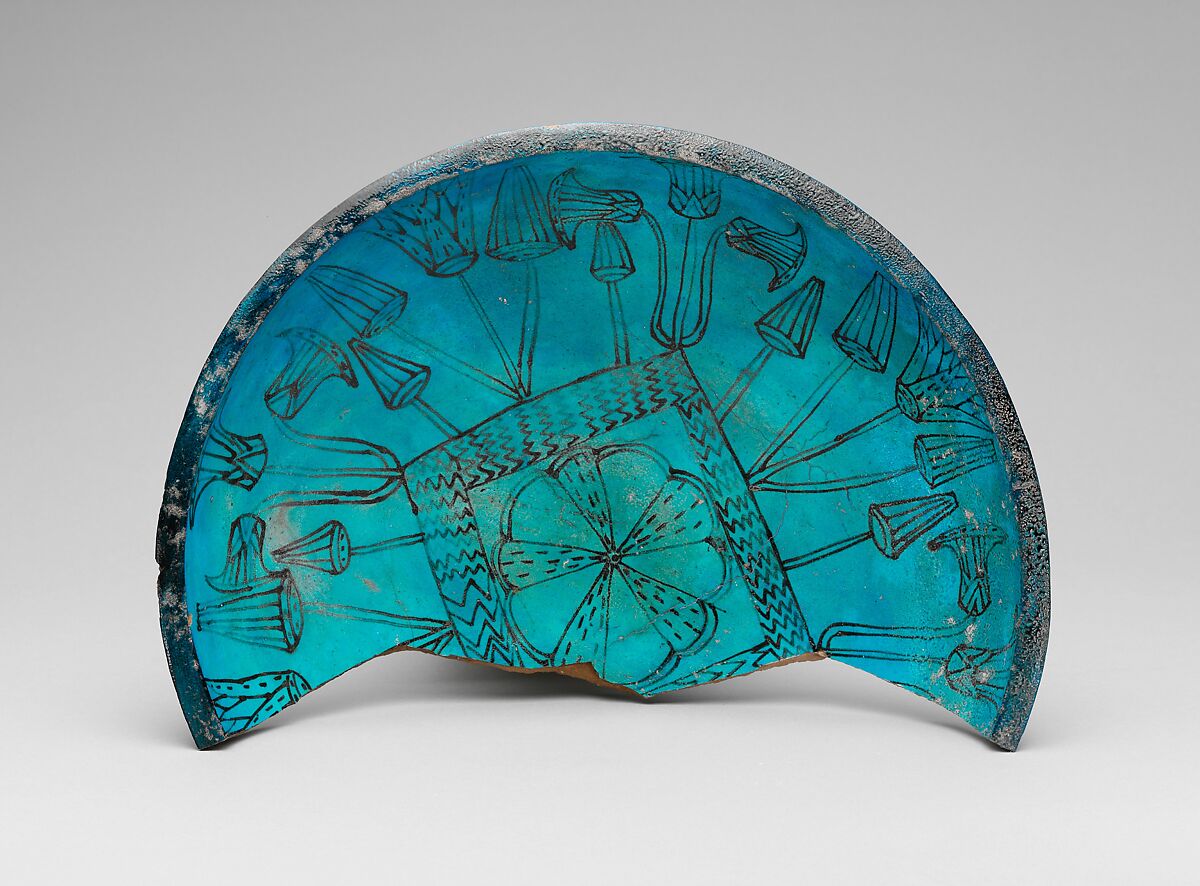 The bowl's interior is decorated with a pool surrounded by blue lotus (Nymphaea caerulea) and papyrus flowers. The underside shows the petals and sepals of an open lotus. These motifs symbolize the themes of fertility, rebirth, and regeneration. Shrines dedicated to Hathor produced large quantities of such bowls, some of which have decoration that clearly symbolizes the goddess; others, like this one, bear patterns that are more general. The bright blue color reinforces the importance of the gift to Hathor, "Lady of Turquoise."