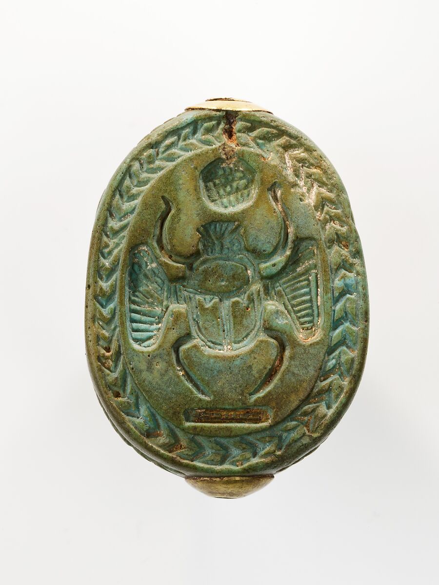 This scarab was found in the same coffin as the statuettes of Amenemhab (26.7.1413a, b) and Huwebenef (26.7.1414a, b). An interesting mixture of designs indicates the lively individuality of artworks made during this transitional period. The back type, which has no indication of the beetle's wing cases, is typical of Second Intermediate Period scarabs found in the Nile Delta, and the rope pattern framing the design on the base had been used since the Middle Kingdom; both of these designs continued into early Dynasty 18. The winged scarab on the base is a new feature that becomes more common during the reigns of Hatshepsut and Thutmose III. The notches on the beetle's carefully delineated wing cases are found regularly on the backs of scarabs dating to their joint reign.