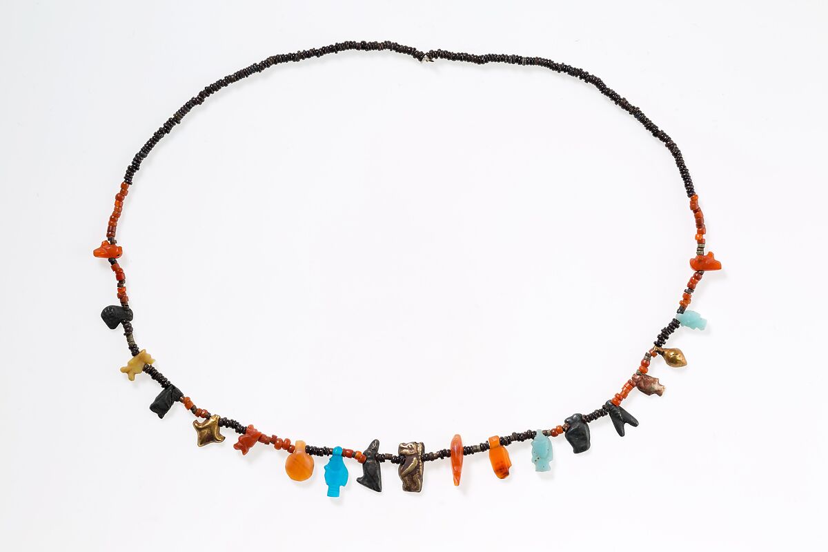 This necklace is composed of tiny disk beads interspersed with a variety of amulets, including falcons, a frog, Tawerets, a lotus, bolti fish, a shell or bullae, a hand, and a "nefer" sign. Some amulets, such as the lotus, frog, and fish, symbolize fertility, while Taweret and the falcon offer protection. The "nefer" hieroglyph conveys a good wish. This necklace was one of three stored in a small jewelry box in a man's burial.