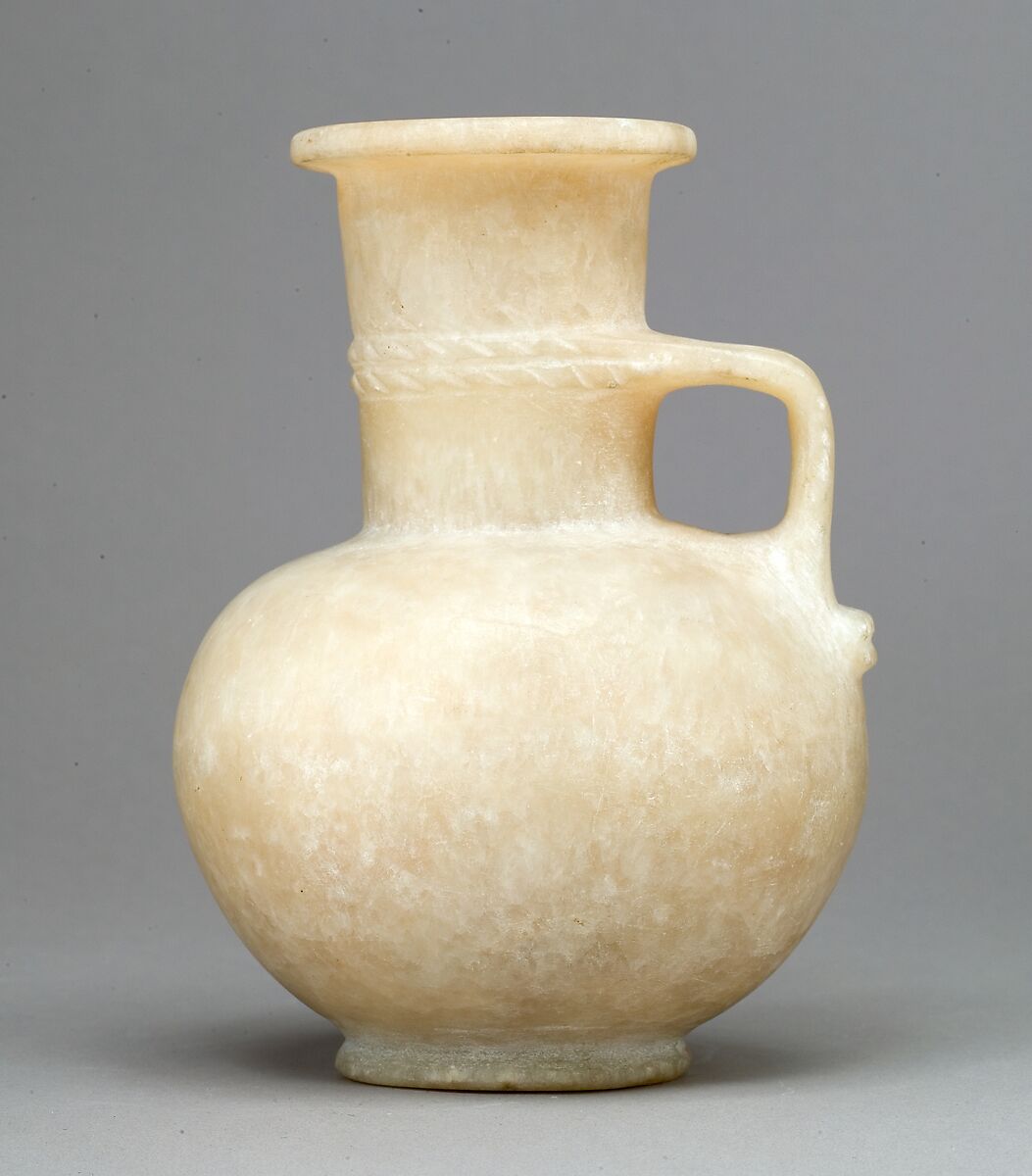 This handled pitcher is an ointment jar. Handled jugs were included in sets of jars for the seven sacred oils as early as Dynasty 4, approximately a thousand years before this one was made.