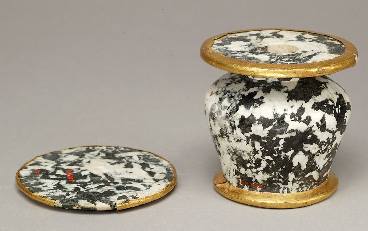 A set of cosmetic jars highlighted with gold foil (26.8.29a, b–26.8.39) are associated with the grave goods of three foreign wives of Hatshepsut's nephew, Thutmose III. Most of these vessels are inscribed with the king's cartouche, marking them as royal gifts.