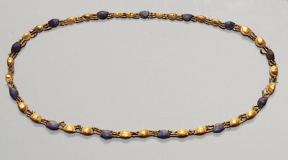 - Title:Girdle with gold and lapis wallet-shaped beads