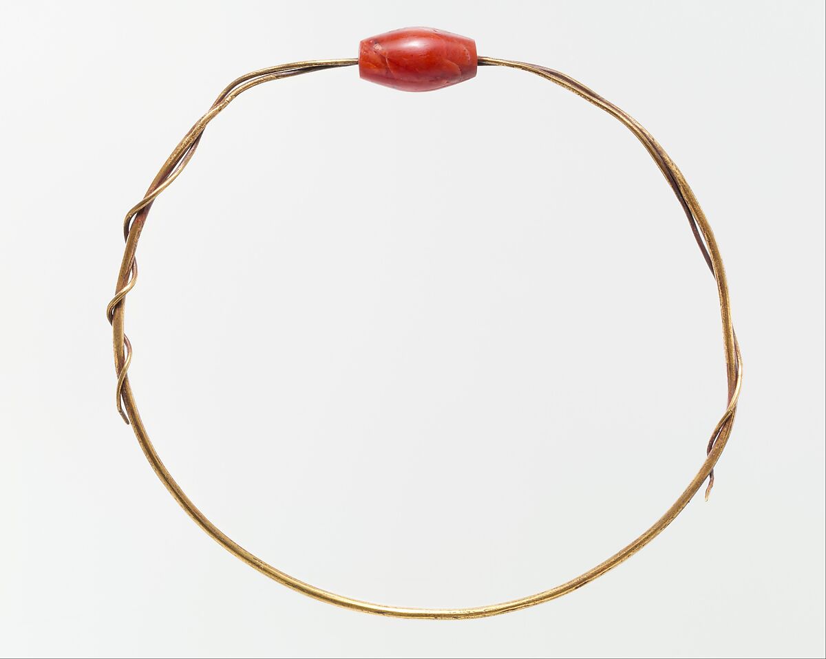The "sweret" bead, when first used in the Middle Kingdom, was worn on a string around the neck (see 11.150.15b). Found in the New Kingdom burial of an Egyptian queen, this bead may have been intended to continue in the old practice. In later times, such beads seem to have been strung on wire and slipped around the mummy's arm.
