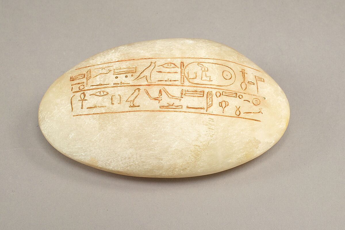 This stone is inscribed, "The Good Goddess, Maatkare, she made [it] as her monument for her father, Amun-Re, at the stretching of the cord over Djeser-djeseru-Amun (Hatshepsut's mortuary temple), which she did while alive." Sometimes described as clamshells because of their shape, stones such as this one probably represent tools of some sort, such as hammering stones, that would have been used in the construction of the building.