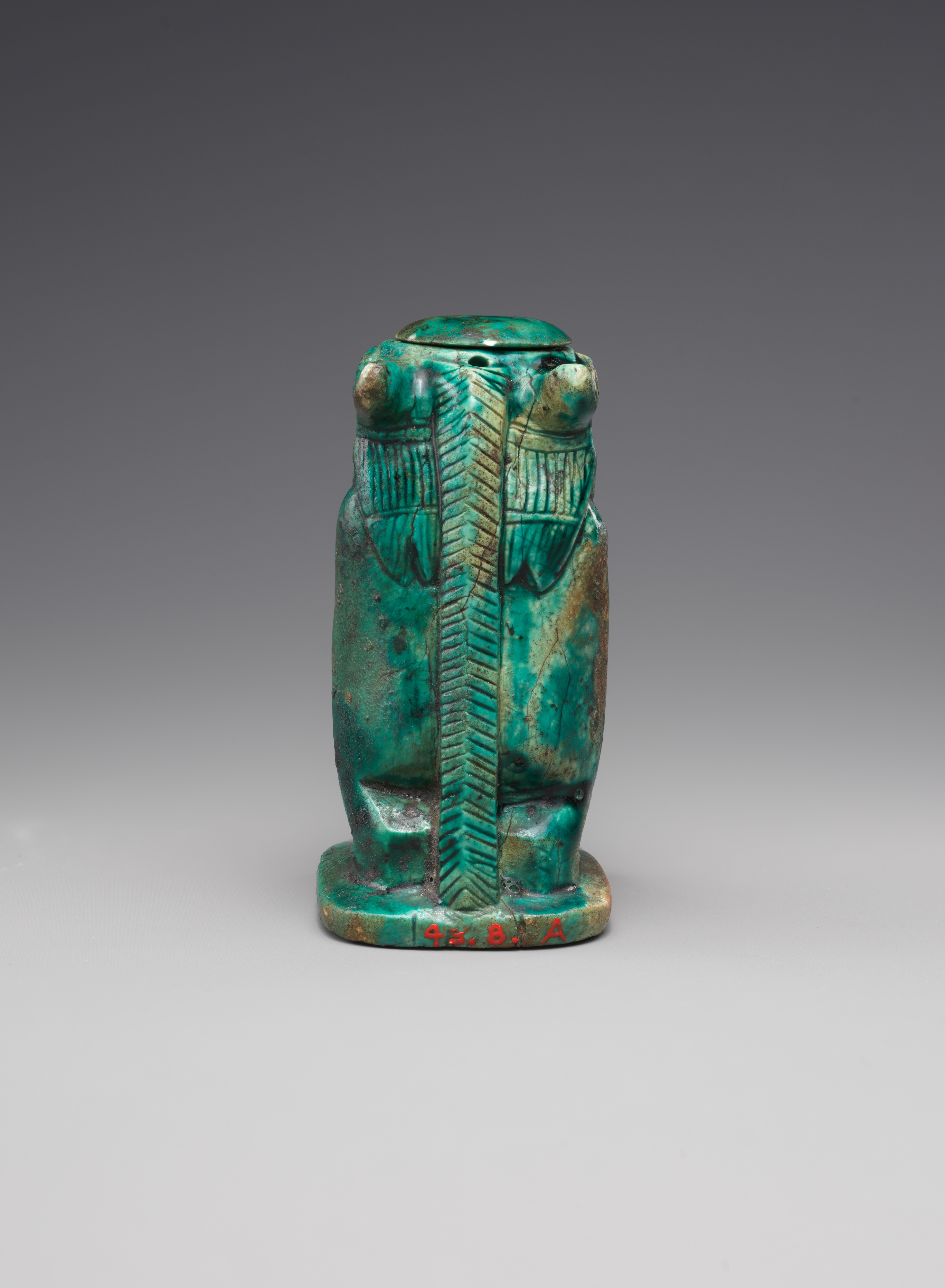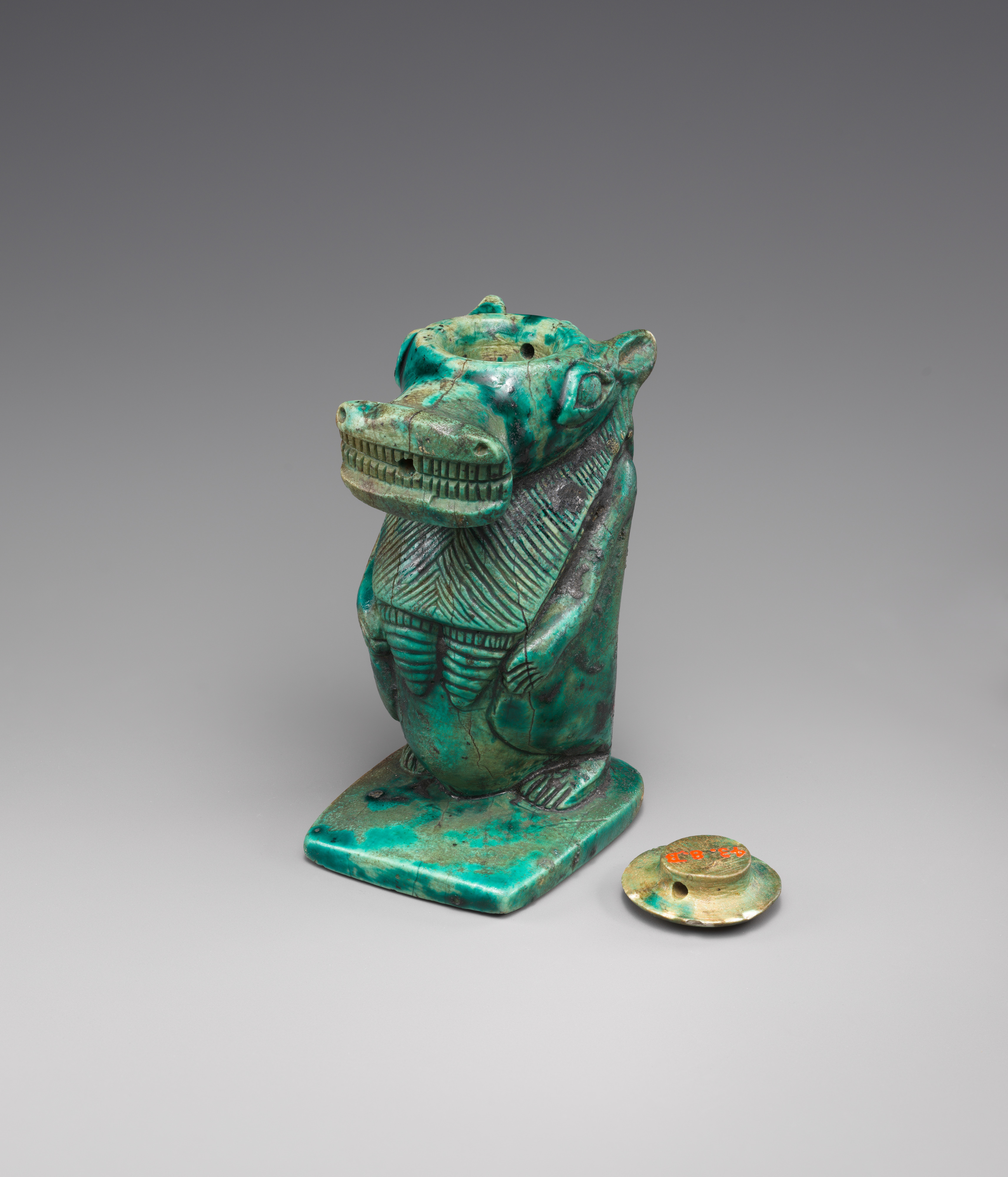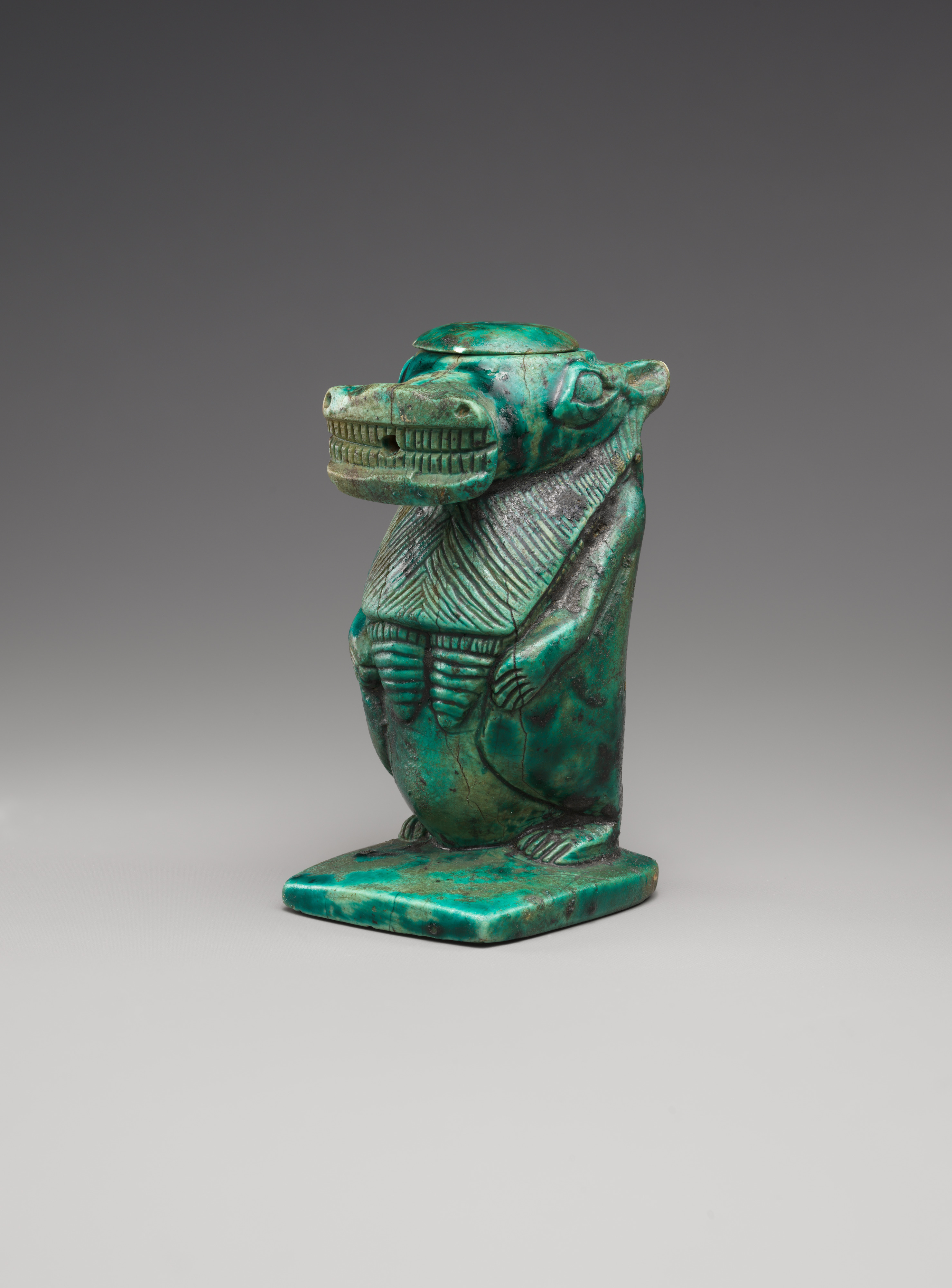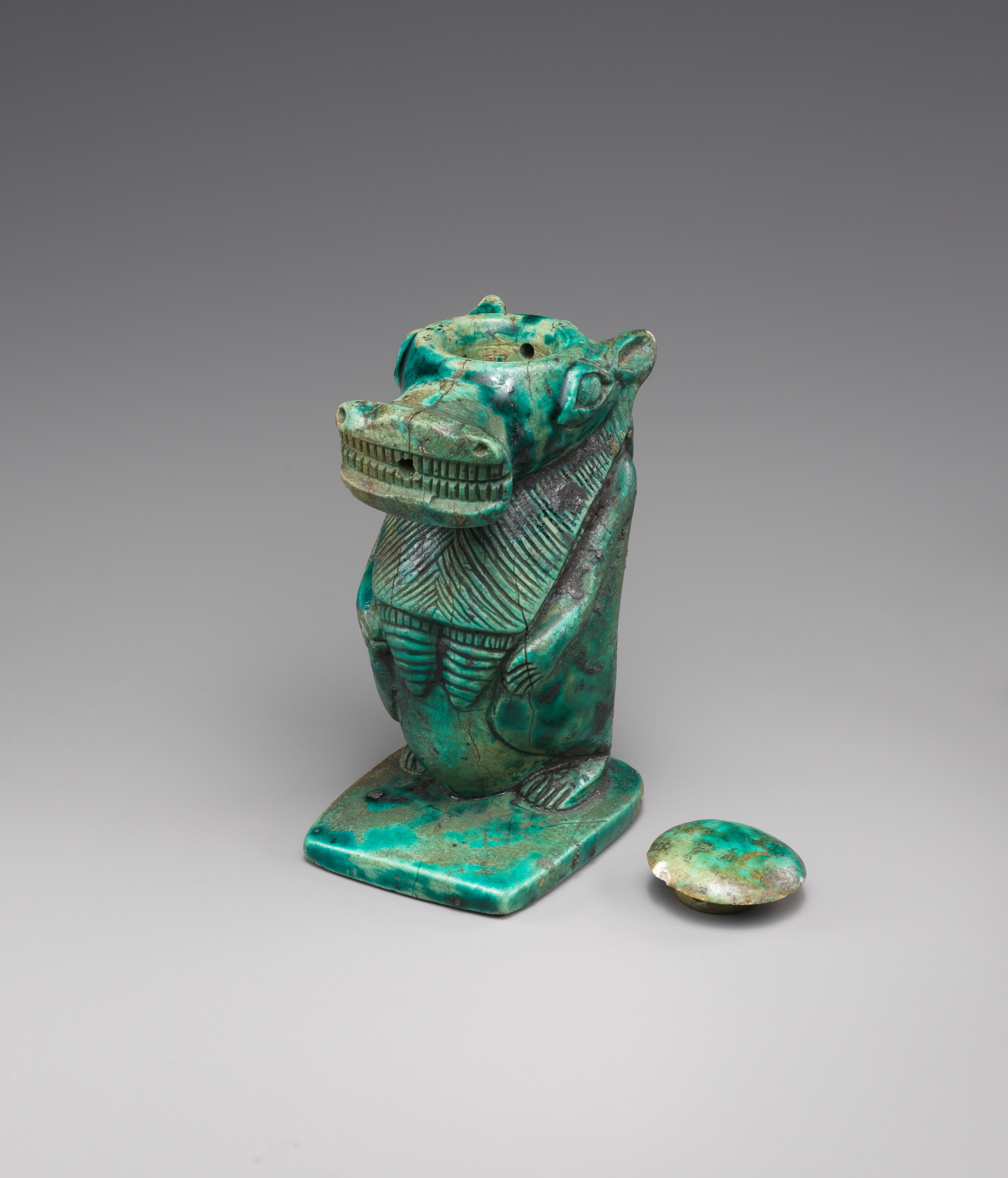 The hybrid hippopotamus goddess that is known as Taweret or Ipet functions here as magical jar. As usual she stands upright and is shown as a fusion of a hippopotamus, lion, crocodile, and human. The cavity inside the figure was accessible through a small rounded lid at the very top. Three openings that are situated between her teeth, at the back of her head, and at the lid might have functioned to insert a wire that depicted a tongue or snake protruding from her mouth. At the same time this wire could have secured the lid. On the underside of the base is a design that shows convoluted coils and that is known from seals. Intertwined coils, loops, and knots were all magically powerful objects that were connected to protection and the creation of life. The hippopotamus goddess protected women in childbirth and it is possible that a small magic papyrus, maybe a spell for mother and child, was stored in this jar. The container might additionally have been used as part of a magical act when the spell was recited, evoking the protective goddess that is represented here and possibly using the jar’s underside to press its magically powerful design onto the pregnant woman or infant.