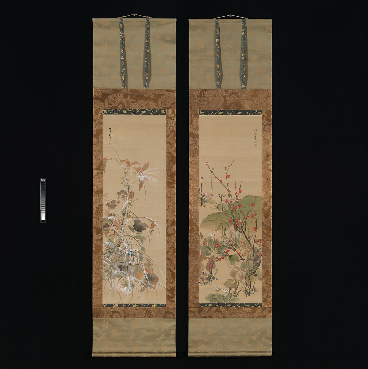 The right-hand scroll depicts flowers of the spring and summer seasons; the left, flowers and foliage of autumn and winter. Both works are executed in subtle yet rich tones and soft washes of color; leaves, branches, and flowers are rendered in the “boneless” manner—devoid of outline—that was typical of established Rinpa style. In numerous areas pigments are pooled or puddled together to create a mottled effect, a technique known as tarashikomi.