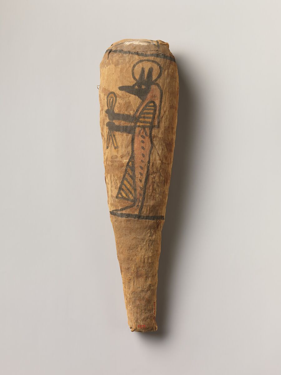 - Title: Sacred animal mummy in the form typical of a wrapped ibis, decorated with a figure of Duamutef