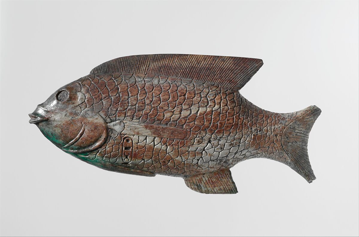 The bolti fish, or tilapia, common in the Nile valley since ancient times, is easily recognized by its long dorsal fin. The fish, which hatches its eggs in its mouth, was a symbol of regeneration and was also associated with the goddess Hathor and the sun god, Re. While carved in the round, this object is actually a fish-shaped dish, with a depression in one side that would have been used for the preparation of cosmetics. The cartouche just behind the gill contains the throne name of Thutmose III, Menkheperre. The dish may have been given by the king to a temple.