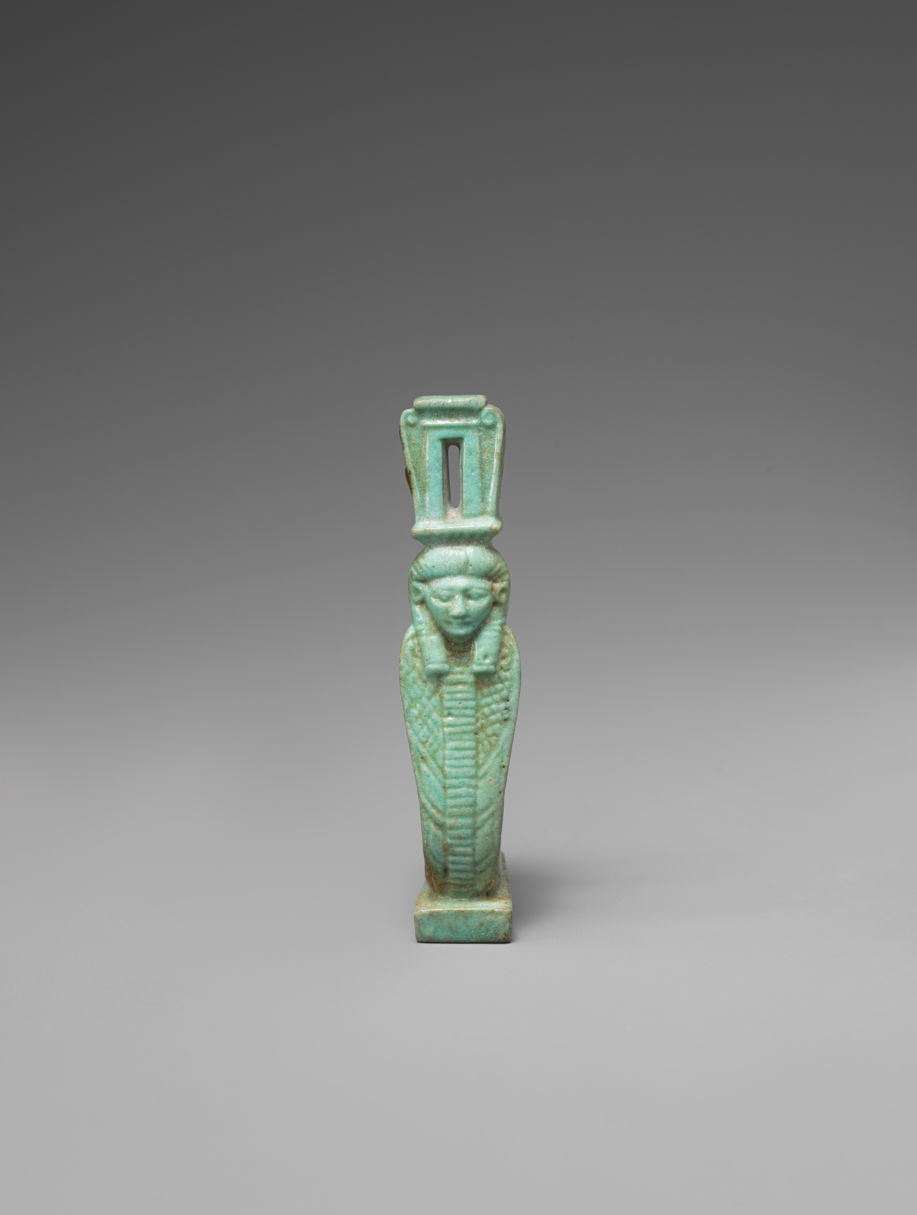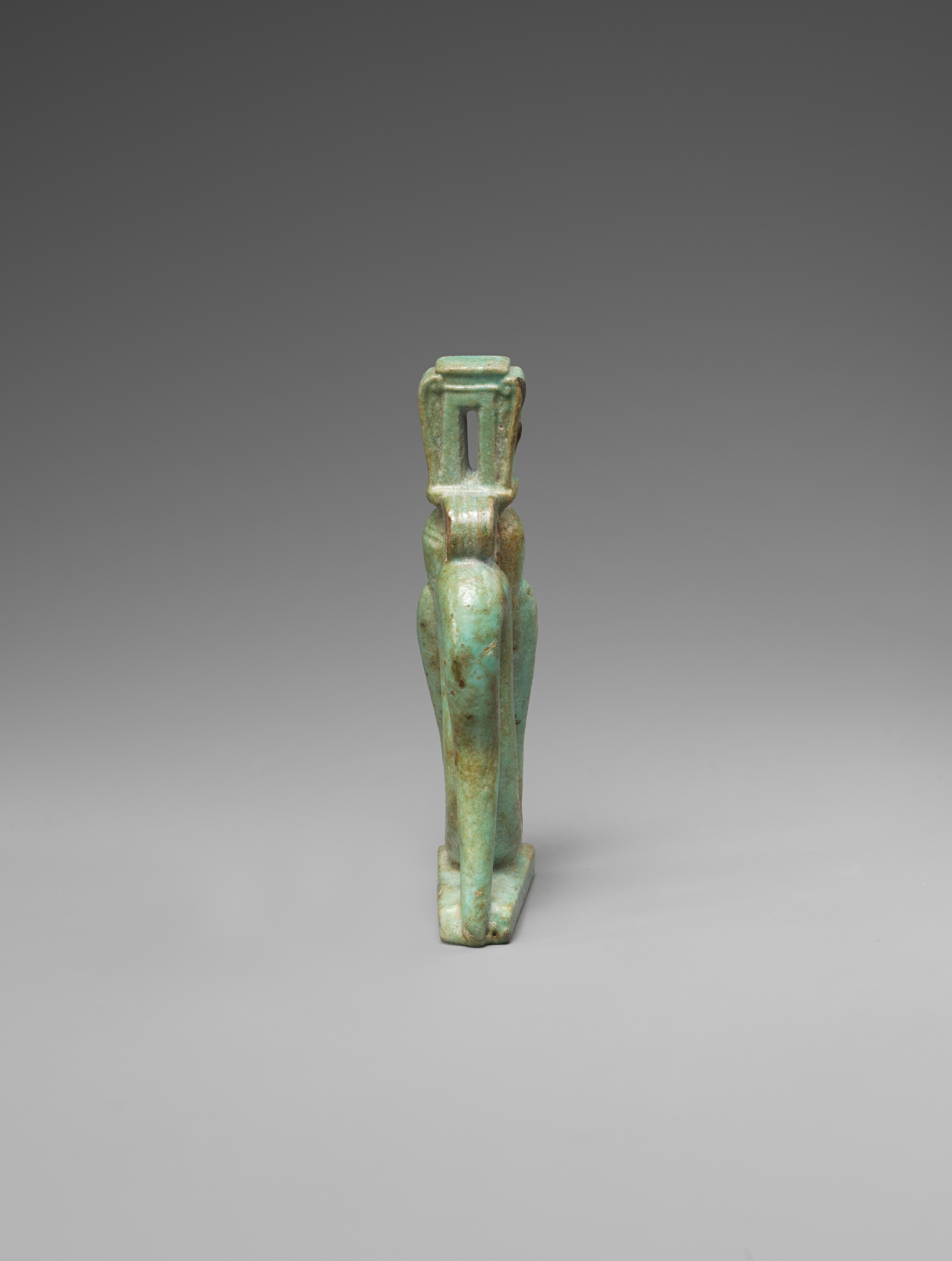 In Ancient Egypt, deities are often depicted with a human body and an animal head. Less frequently, a human head was attached to the body of an animal, in this case a cobra. The snake is shown rearing on a low base; its weight is placed on the first, bottom segment of the body and on the tip of the tail, which protrudes slightly over the back of the base. Its body is only bent twice, so that the cobra rears up high. In the center of the snake’s wide hood is a vertical column of ventral plates. A crisscross pattern marks the upper part of the hood, with three diagonal ventral scales framing the lower part of the vertical column. Emerging from the hood is a human head wearing a long, tripartite wig bound with ribbons. The ears are very narrow where they meet the face and then widen, as is typical for cow’s ears. The sound box of a sistrum (a cultic musical instrument) on top of the head takes the shape of a small shrine framed by inward curving volutes. Behind the back of the head is a pierced loop for suspension. For an identification of the deity represented here, please see the curatorial interpretation below.