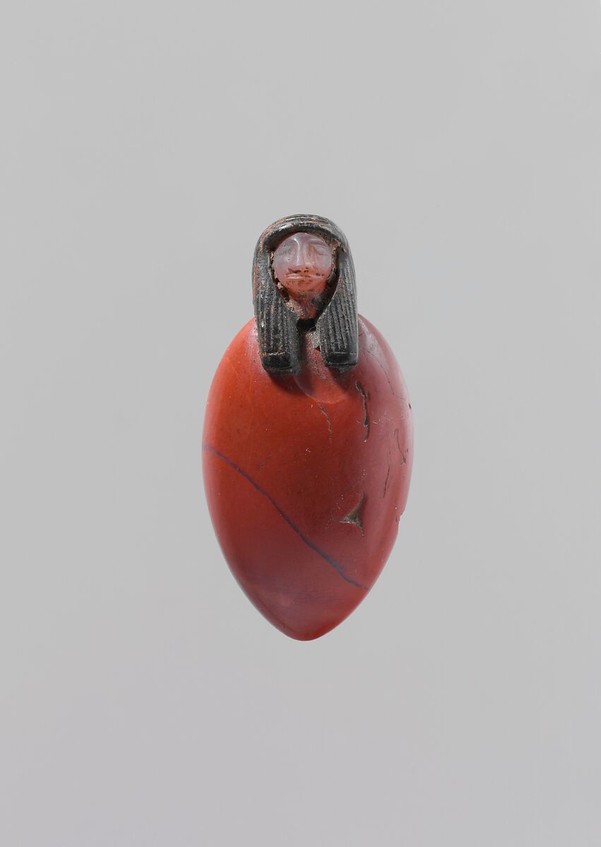This unusual looking amulet is a combination of a simplified heart and a human head. The heart, of red jasper, is depicted as a flat, oval object with slightly rounded front and back surfaces and a pointed bottom. It does not have side projections, which are known from other heart amulets that depict the organ more naturalistically. At the top is a small, carnelian human head, which was manufactured separately and attached to the heart. Details of the face, such as the nose, eyes, and mouth are carved, but mainly due to the amulet’s small size and the hardness of the material, they are not well defined. A long, striated, black wig made out of chlorite conceals the junction between the two parts. The amulet is pierced twice latitudinally. The top piercing runs through the head, and a second is positioned in the lower third of the amulet. These piercings were possibly intended to fasten the amulet onto the bandages of a mummy.