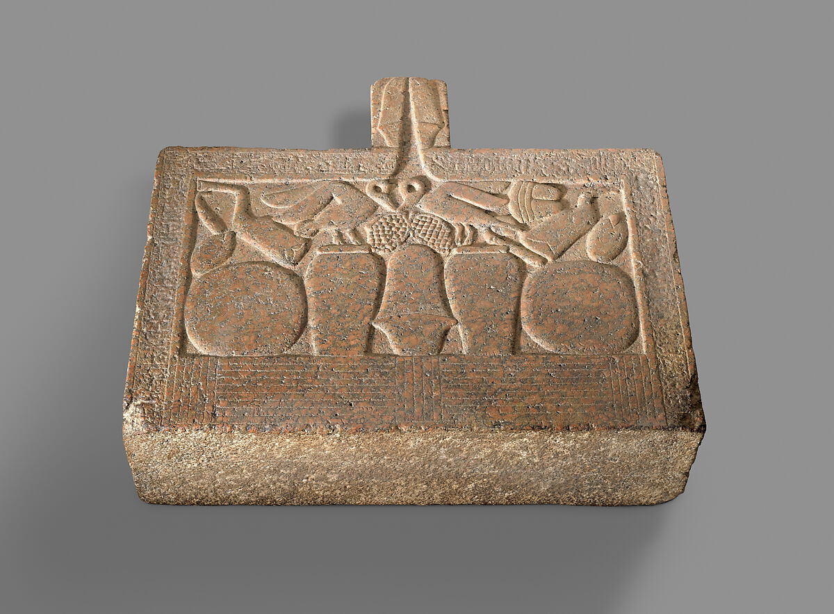 The inscriptions give Pabasa's name and his titles Chancellor of the Divine Adoratrice and Governor of Thebes.The Divine Adoratrice in question is Nitocris who is mentioned elsewhere in his tomb, and the pharaoh at the time was Psamtik I. Surrounding the upper edges is a prayer derived from the Pyramid Texts, given under translation; it is difficult to read as the inscriptions were subsequently rubbed away. The offerings depicted are, at bottom, loaves of bread and two jars for water and beer, surmounted by cuts of meat, cucumbers, fowl and grapes. The projecting end of the table is grooved to allow the runoff of libations poured over the texts and offerings.