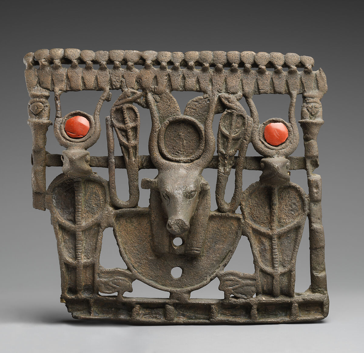 Beneath a frieze of uraei held up by Hathor columns, a bovine face peers out. The head is mounted on a collar to form an aegis, and the animal wears a disk and long straight horns with two curling plumes. Also mounted on the aegis collar are two uraei that turn inward toward the bovine. Two other large uraei crowned with disk and horns flank the central unit. On the back are four large rings that would permit mounting.