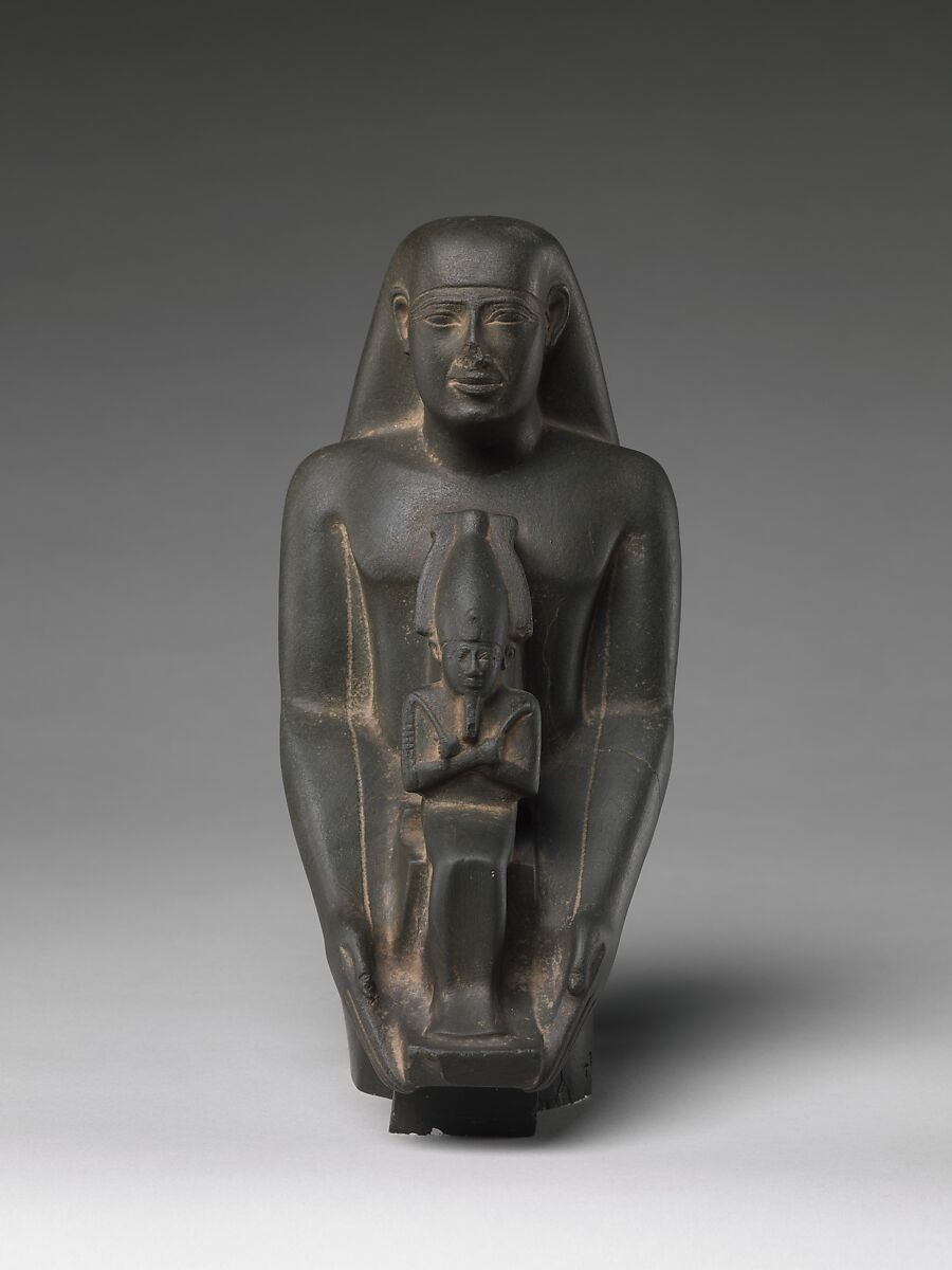 This statue depicts the priest Padiamunrenebwaset. Padiamunrenebwaset has balanced, slightly smiling features with very long narrow eyes. The priest's fingertips curl very slightly to hold a seated figure of Osiris.