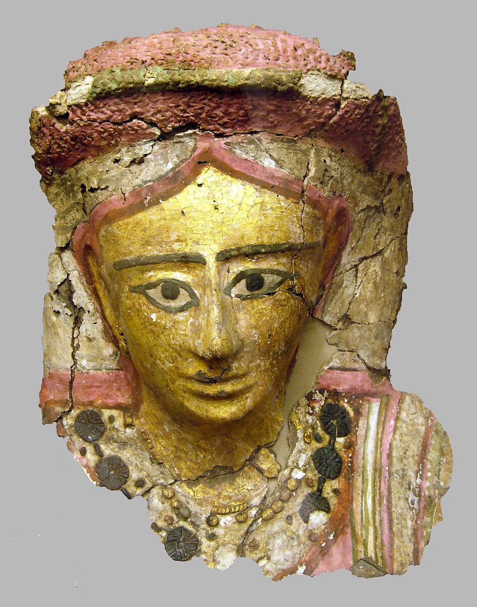 This fragment has the characteristics of coffins created in Akhmim in the second half of the first century BC and the early part of the first century AD. It is created from mud and straw, and like female coffins in that group shows the deceased wearing a great large floral crown bound with a ribbon, a straight Egyptian wig, and on the shoulder a vertically striped/pleated garment.