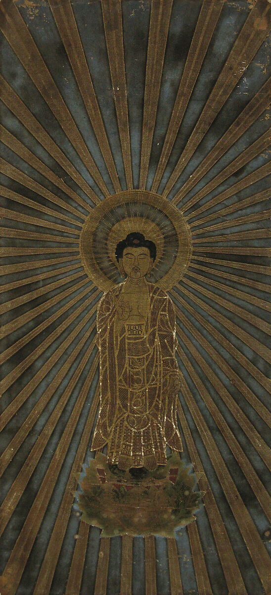 This image of the Buddha Amida (Sanskrit: Amitābha) radiating beams of light was created as a private devotional image, most likely for the home altar of a follower of the True Pure Land School of Japanese Buddhism. Unlike deluxe icons made for major temples, a work like this one would have been attached to a paper backing before it was painted—a form of prefabrication. After the image was executed, it would have been mounted on bright silks. Similar examples produced today are sometimes made in sets of three, with Amida at the center; Shinran, the founder of True Pure Land Buddhism, to the right; and Rennyo, the reviver of Honganji Temple, to the left. Alternatively, Amida is flanked by calligraphic inscriptions of ten and nine characters, respectively, known as myōgō. The simplest myōgō used in True Pure Land Buddhism is six characters, and translates to “Hail the name of Amida Buddha.” Although some of the pigments are lost, much of the cut silver foil remains, and is untarnished.
