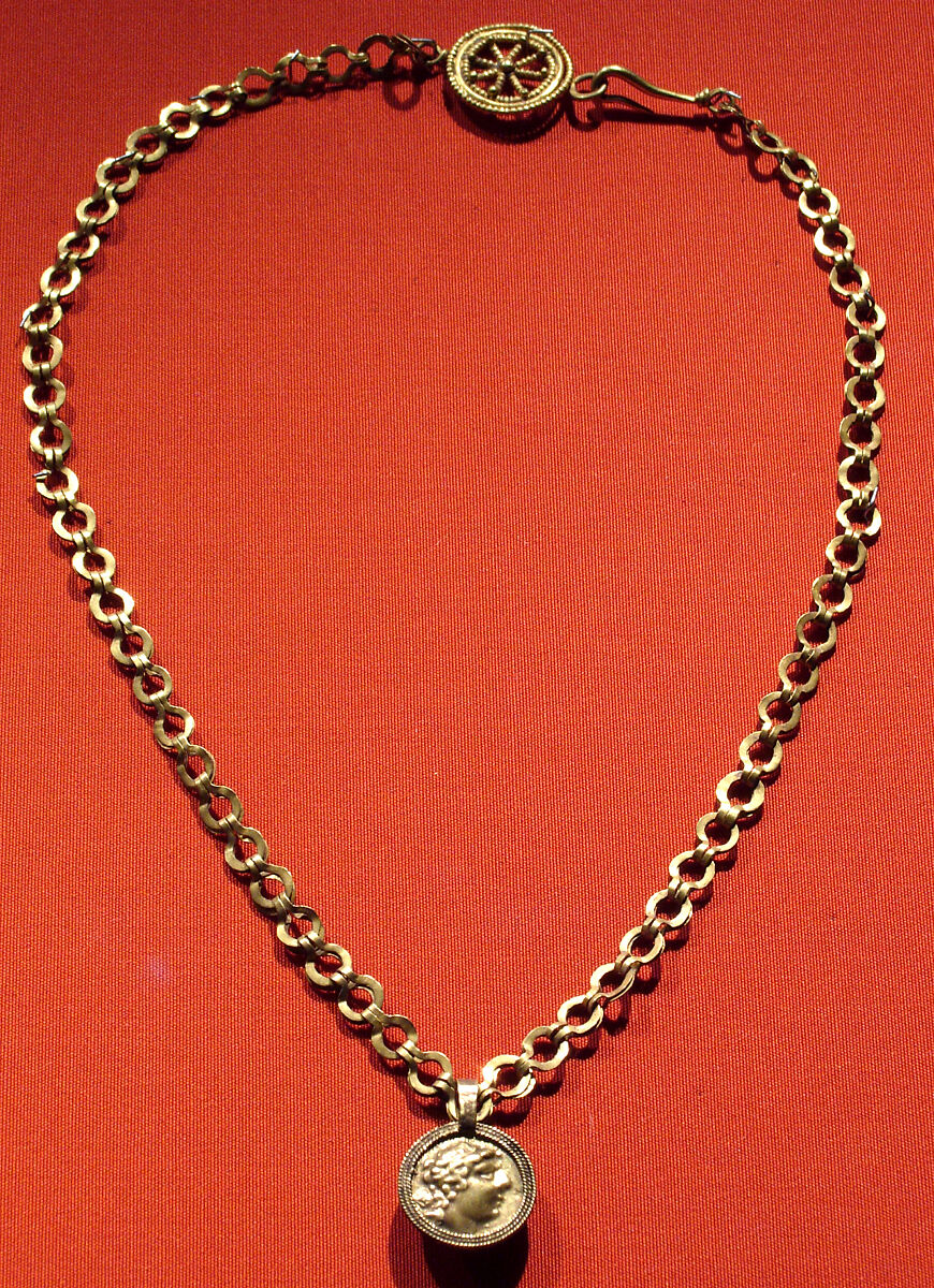 - Title: Necklace with a beaded wire wheel and a pendant with a profile of Alexander (?)