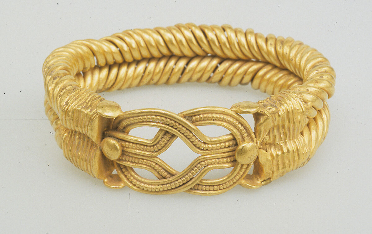 There is a long tradition of bracelets with so-called Herakles knots, but for constructional reasons this one is ascribed to the Roman Period. The woman in the shroud 09.181.8 wears a bracelet with joined twisted tubes that may be similar to this one.