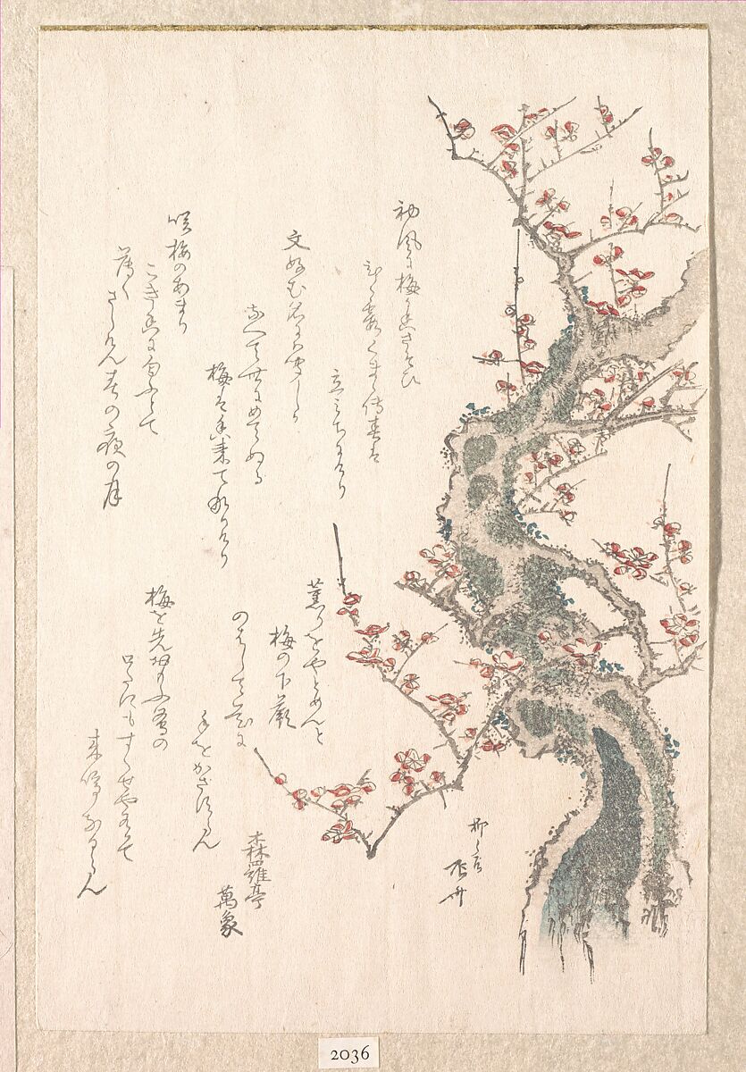 Surimono are privately published woodblock prints, usually commissioned by individual poets or poetry groups as a form of New Year’s greeting card. The poems, most commonly kyōka (witty thirty-one syllable verse), inscribed on the prints usually include felicitous imagery connected with spring, which in the lunar calendar begins on the first day of the first month. Themes of surimono are often erudite, frequently alluding to Japanese literary classics in both texts and images.