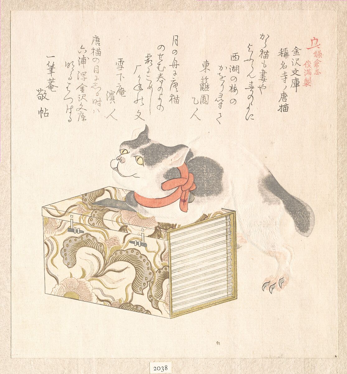 Surimono are privately published woodblock prints, usually commissioned by individual poets or poetry groups as a form of New Year’s greeting card. The poems, most commonly kyōka (witty thirty-one syllable verse), inscribed on the prints usually include felicitous imagery connected with spring, which in the lunar calendar begins on the first day of the first month. Themes of surimono are often erudite, frequently alluding to Japanese literary classics in both texts and images.
