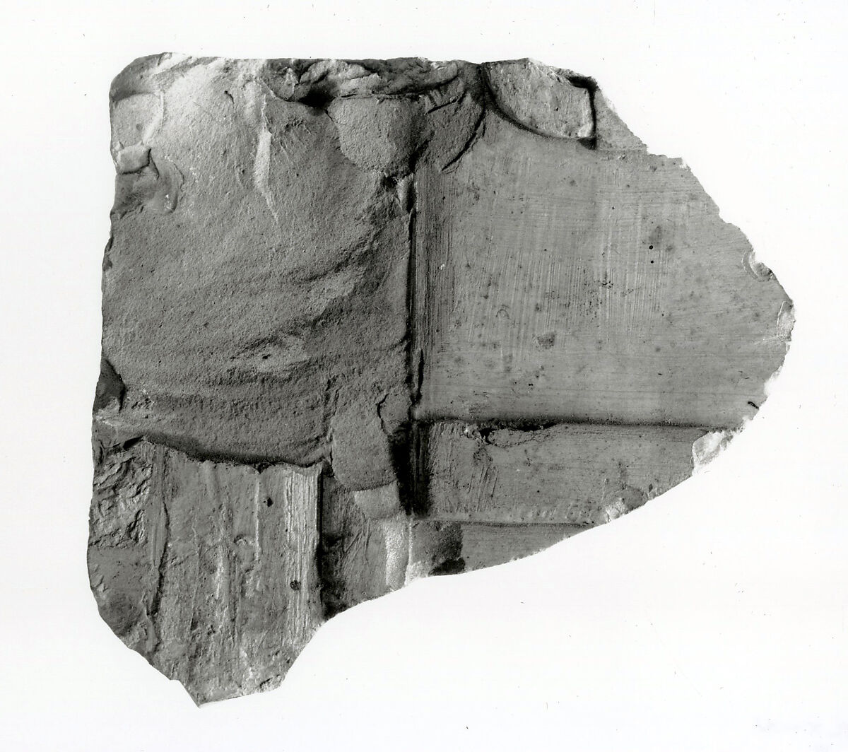 Visible on this varnished and heavily damaged fragment are traces of horizontal and vertical border lines and part of one hieroglyph. This represents a necklace with a cylinder seal, the ideogram for "Sealer," one of Nepekashuty's titles.