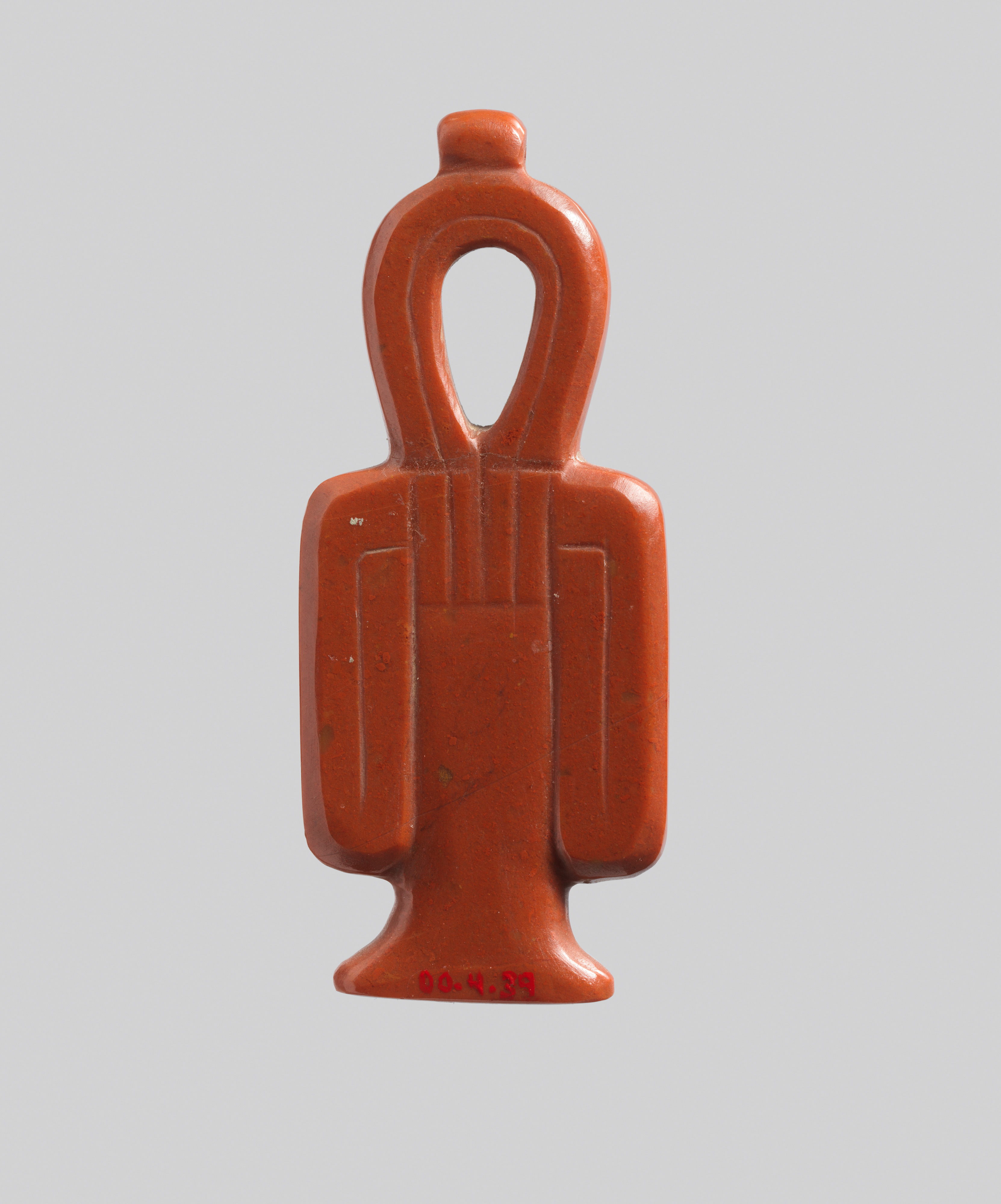 The tit symbol (pronounced teet) illustrates a knotted piece of cloth whose early meaning is unknown, but in the New Kingdom it was clearly associated with the goddess Isis, the great magician and wife of Osiris. By this time, the tit was also associated with blood of Isis. The tit sign was considered a potent symbol of protection in the afterlife and the Book of the Dead specifies that the tit be made of blood-red stone, like this example, and placed at the deceased's neck.