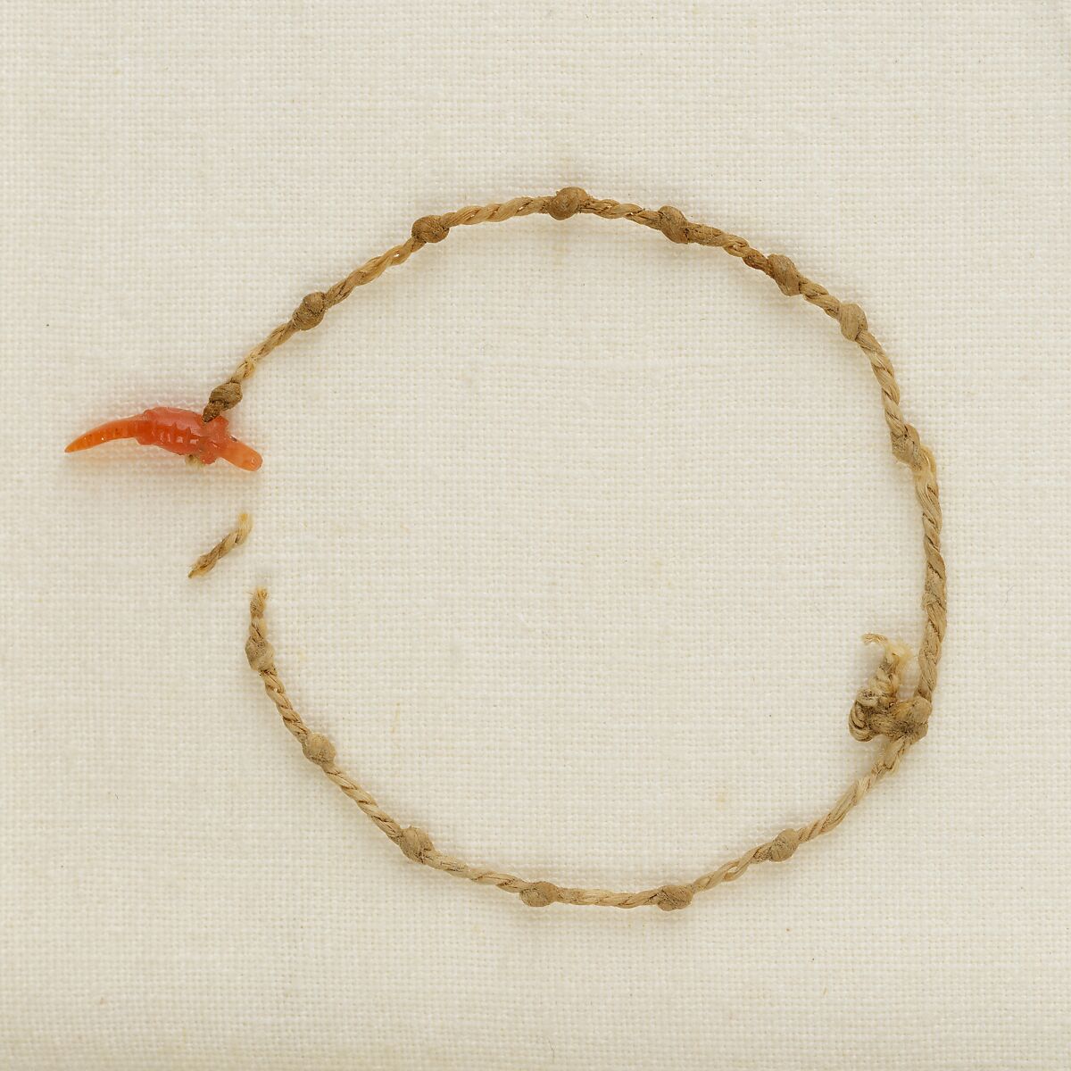 Four bracelets of knotted two-ply linen cord were found around the left wrist of Henettawy’s mummy. Strung in the center of this one is a crocodile of carnelian; thirteen knots are preserved, six on one side and seven on the other. One of the most dangerous creatures in the Egyptian landscape, the crocodile was used for amuletic purposes, as it was thought magically to ward off evil.