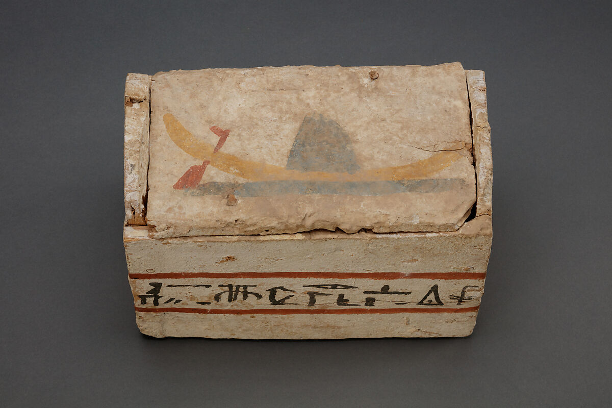 The burial of Ankhshepenwepet included two small wooden shabti boxes with vaulted ends and flat lids. These were painted white, and inscribed with an offering prayer in black bordered with red lines around the box. As was usual for shabti boxes of this era, each lid was painted with an image of a boat in green-blue, yellow, and red, with a band of blue-green beneath the boat to represent water. These representations are likely connected with a pilgrimage to the sacred site of Abydos, cult place of the god Osiris, ruler of the dead. By traveling to this holy place, either in reality or symbolically, the deceased became associated with this god and was aided in his or her journey to join the ranks of the blessed dead.