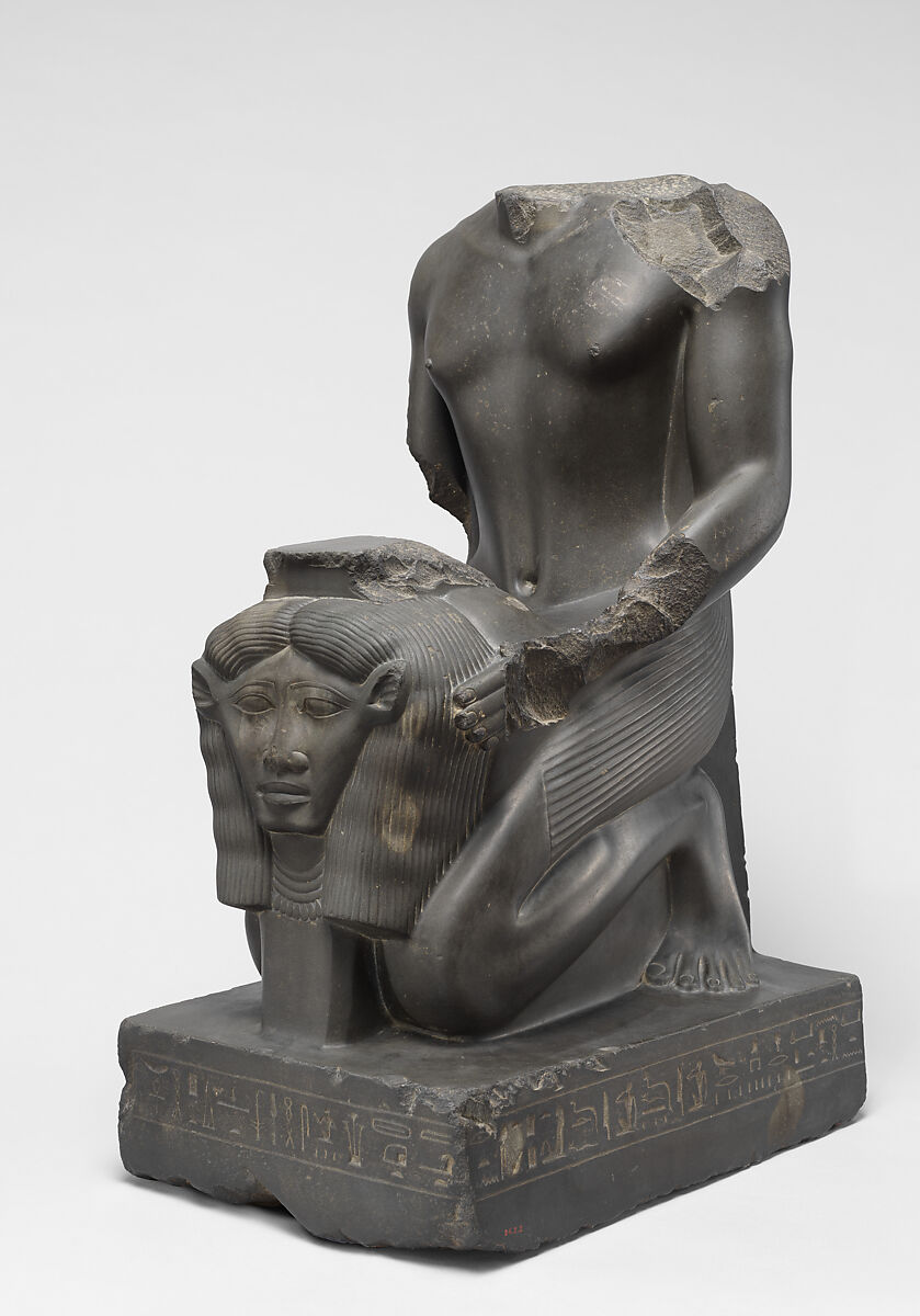 Amenemope-em-hat holds before him the cult object of the cow-eared goddess Hathor. The proportions of this figure, its muscularity, and such details as the slanted ridges of the collarbone and the shallow depression down the center of the torso represent a conscious attempt in the Late Period to emulate the classic works of the Old and Middle Kingdoms.